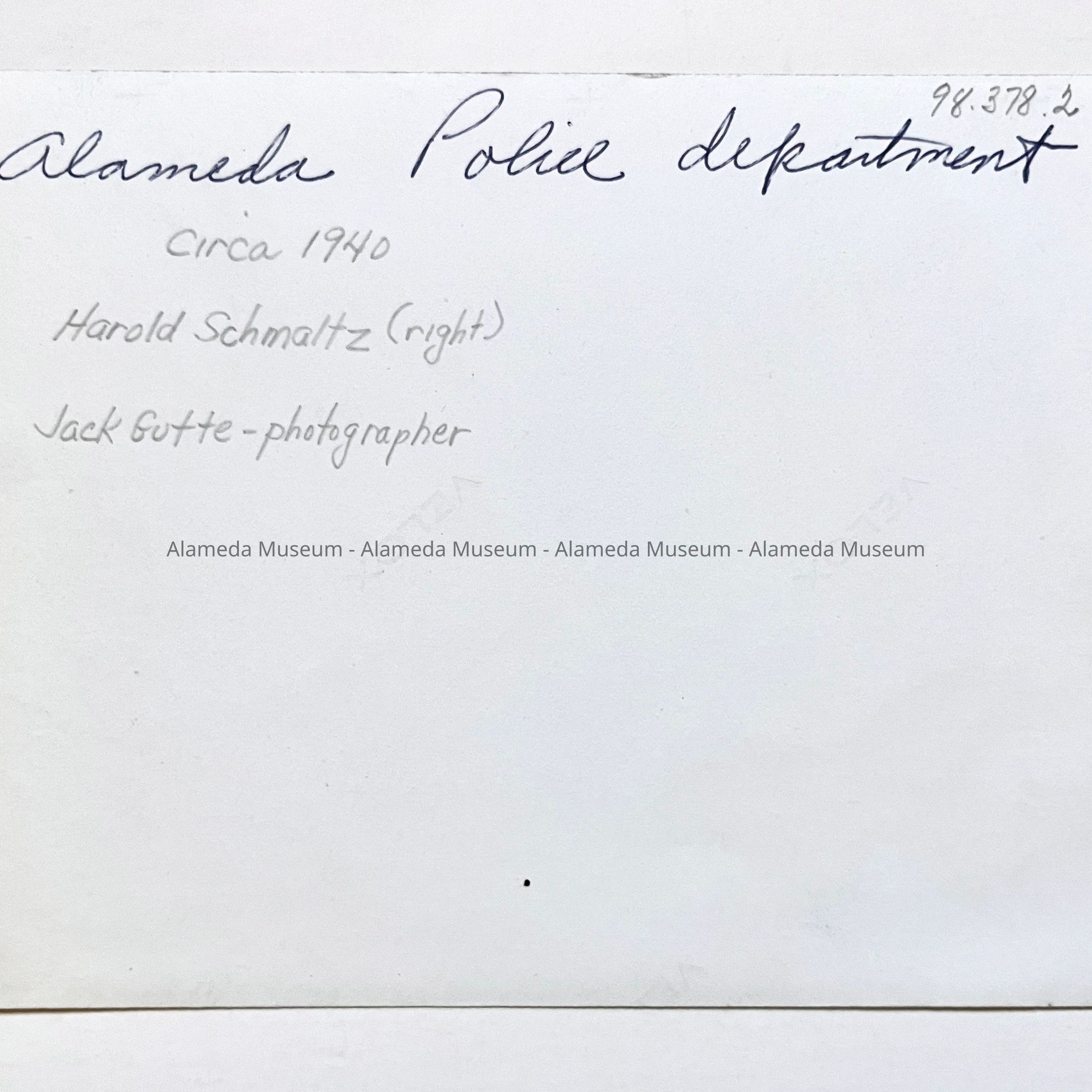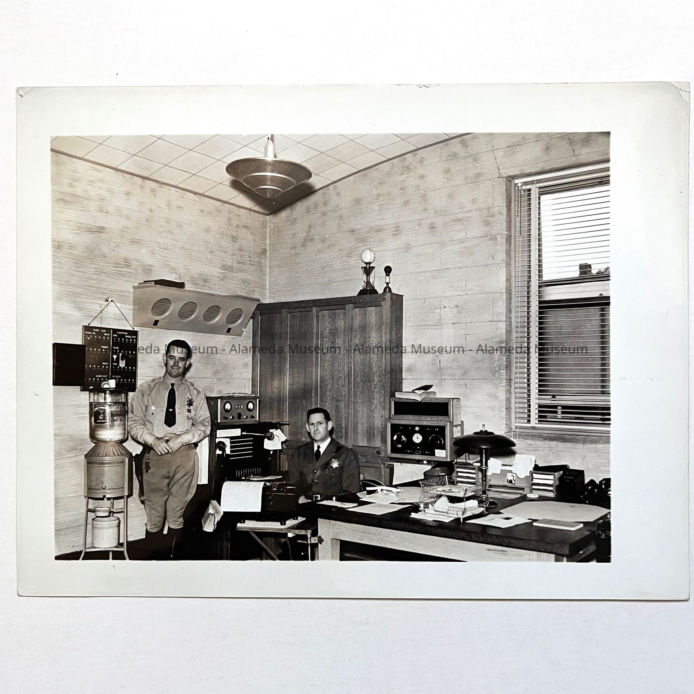 History of Object: Interior view of a police department office showing officer Harold Schmaltz seated at his desk with an unidentified police officer standing next to him.
