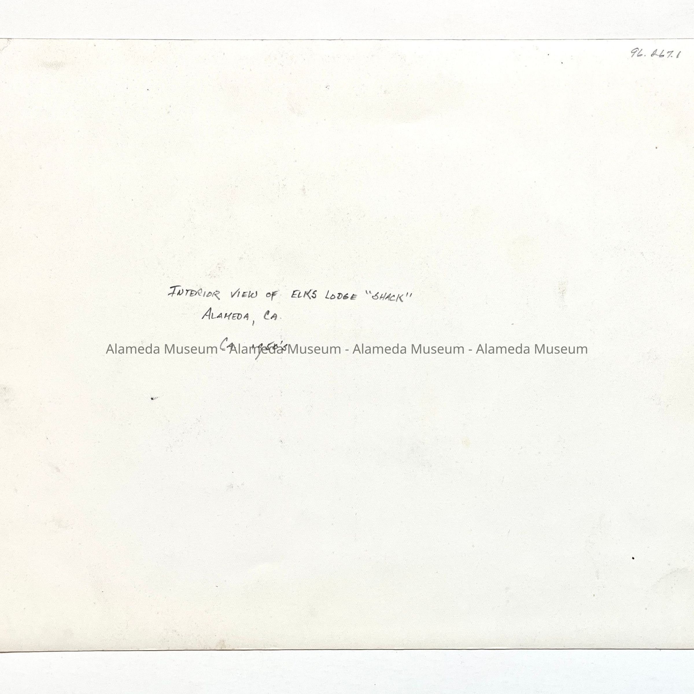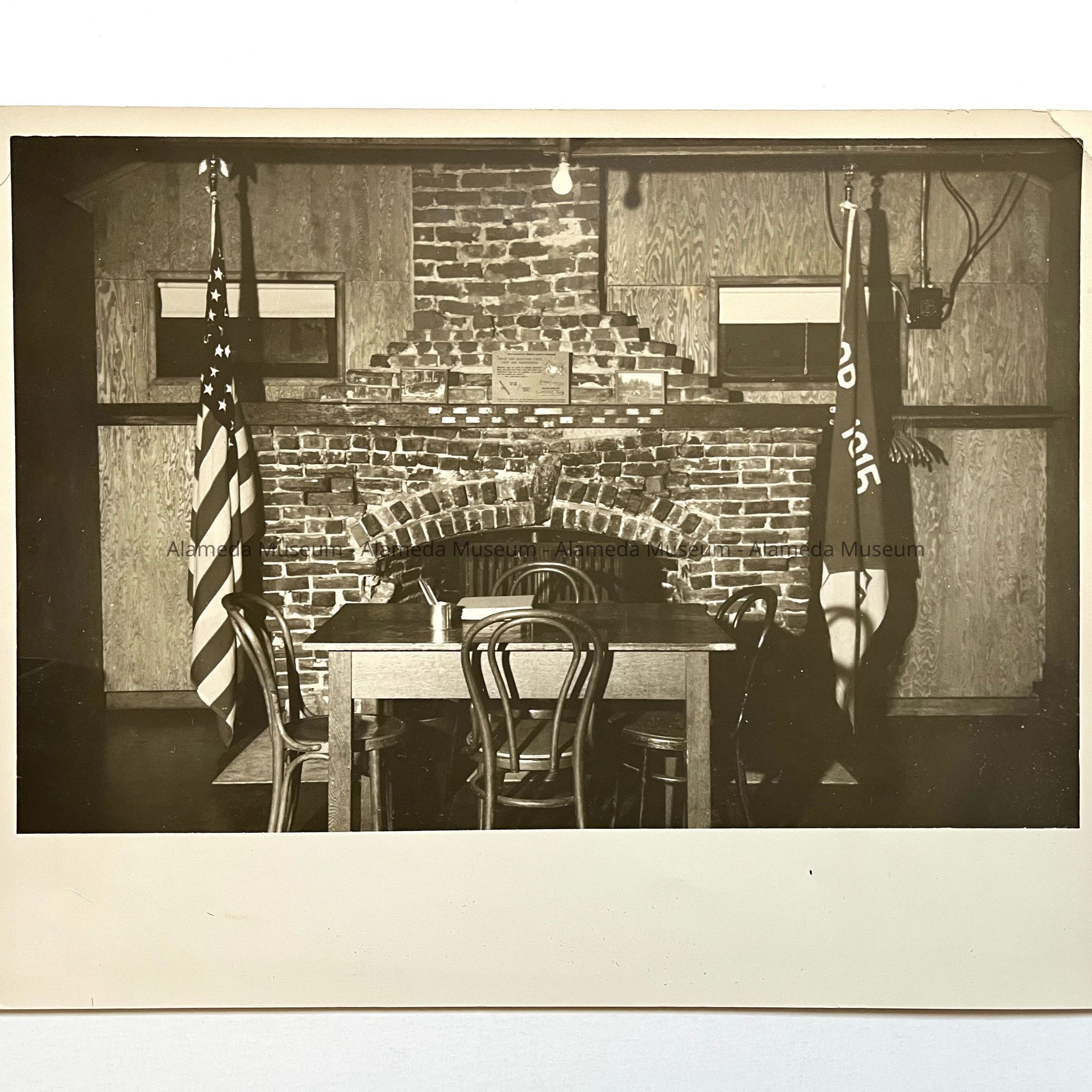 History of Object: Interior view of the Elks Club "Shack", a structure built in one day, showing the stone fireplace.