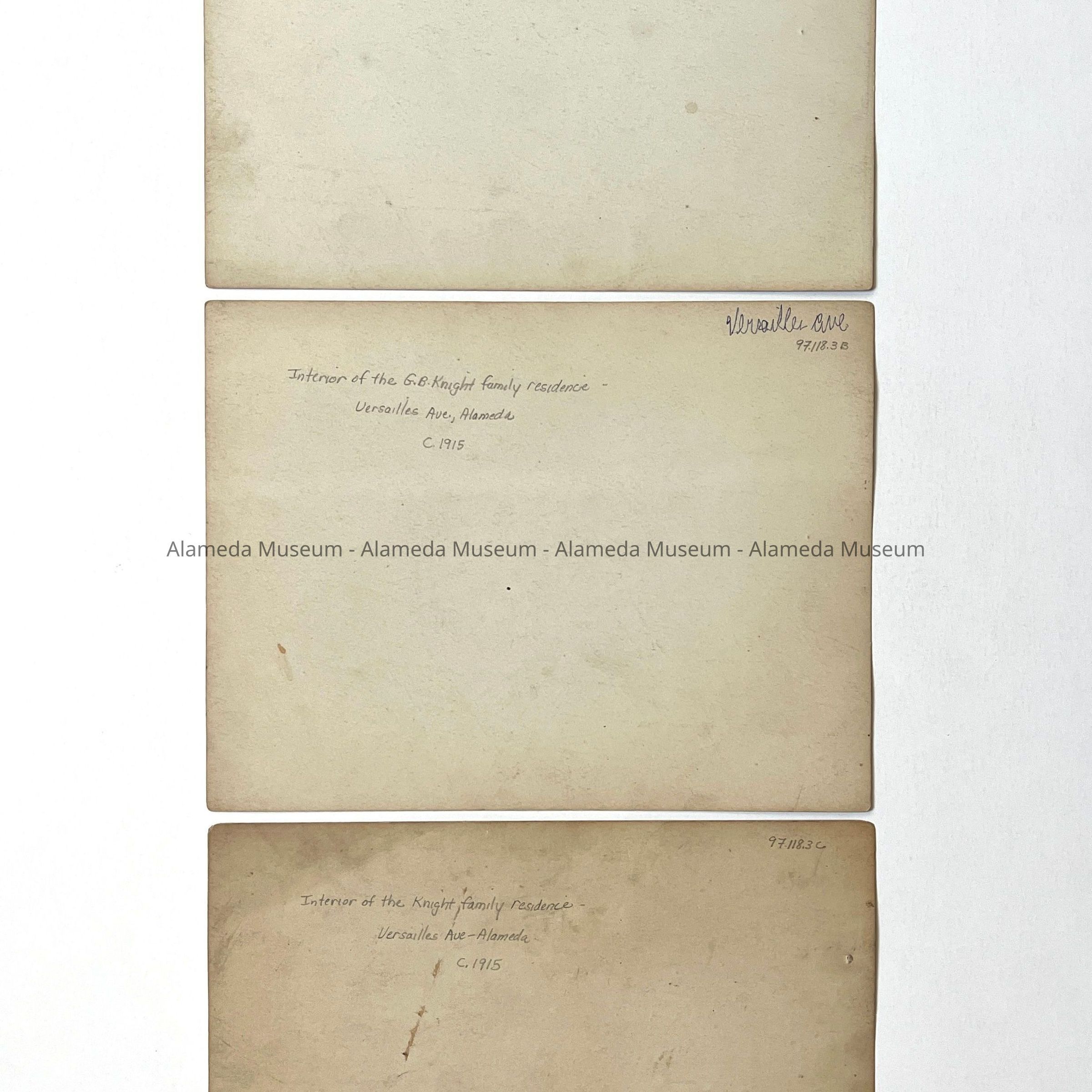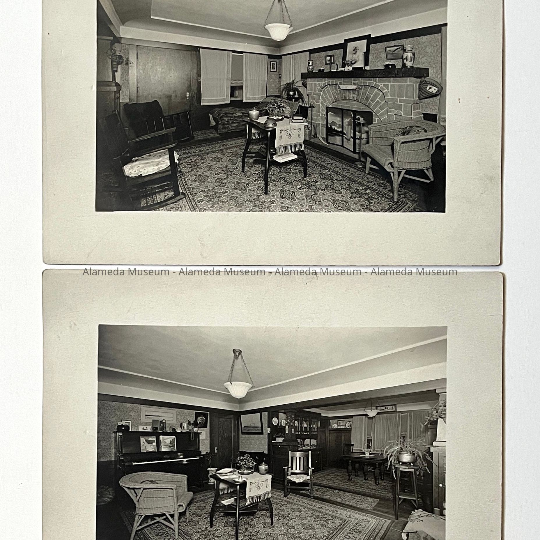 SERIES OF PHOTOGRAPHS OF THE INTERIOR OF THE G B KNIGHT HOME ON VERSAILLES AVENUE, ALAMEDA, CALIFORNIA. THE HOME --- BUNGALOW STYLE --- IS FURNISHED PREDOMINANTLY WITH CRAFTSMANSTYLE FURNITURE. A PORTRAIT OF DAUGHTER, EILEEN, CAN BE SEEN HANGING ABOVE THE MASONRY-CONSTRUCTED MANTEL IN THE LIVING ROOM.