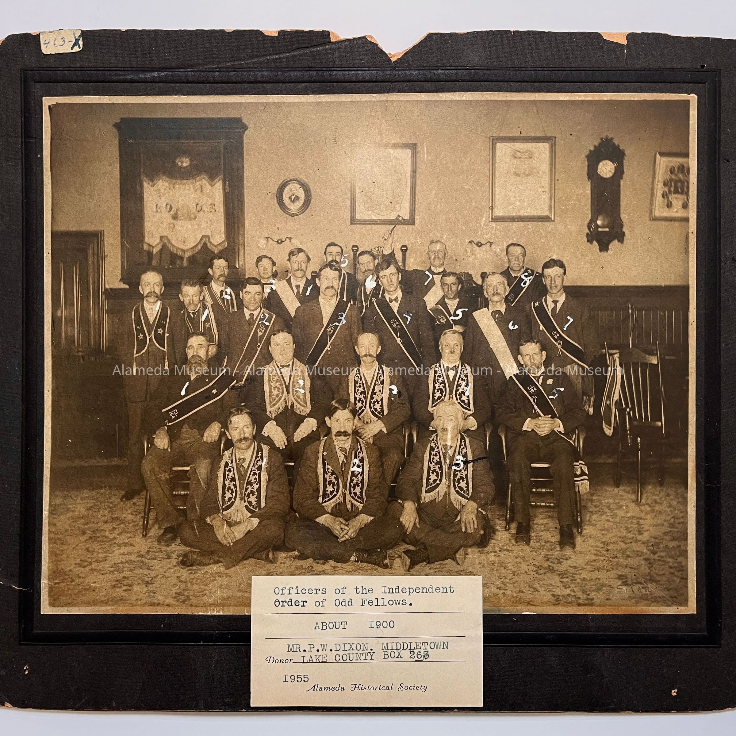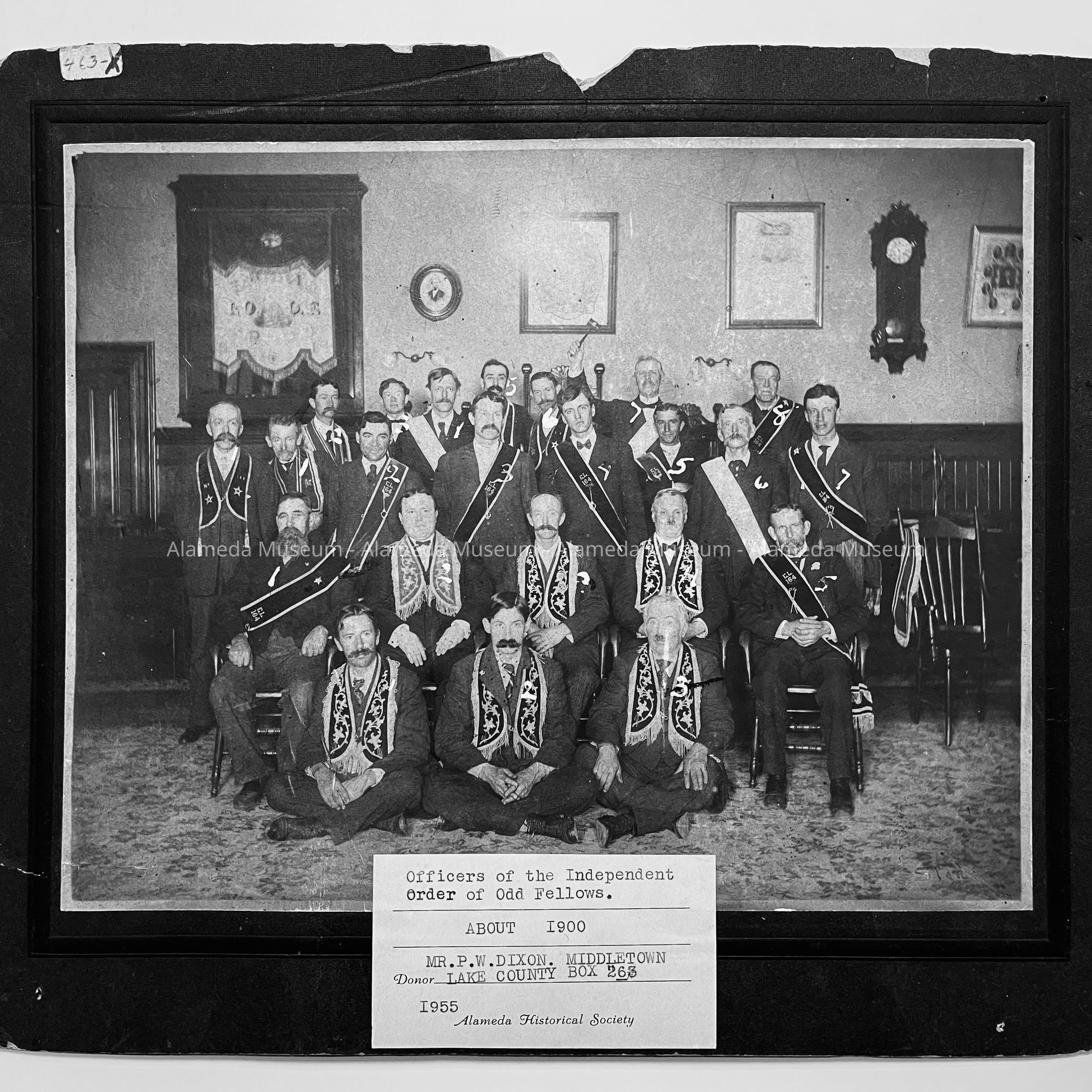 Interior view of lodge, showing the officers of the Independent Order of Odd Fellows. Taken in the old lodge building at the N.E. corner of Park and Santa Clara Sts.