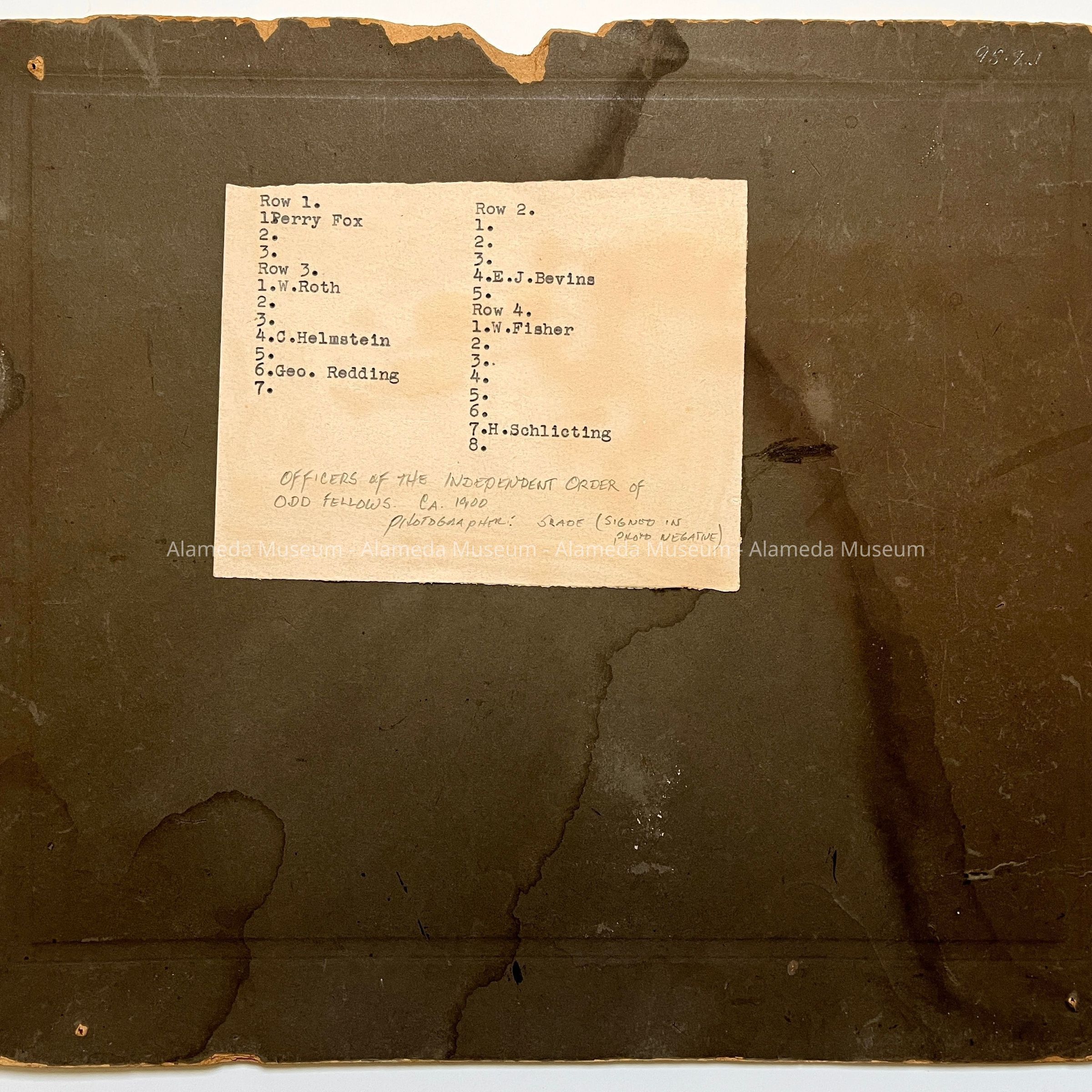 Row 1: 1. Perry Fox; Row 2: 4. E. J. Bevins; Row 3: 1. W. Roth; 4. C. Helmstein, 6. Geo. Redding; Row 4: 1. W. Fisher, 7. H. Schlicting.