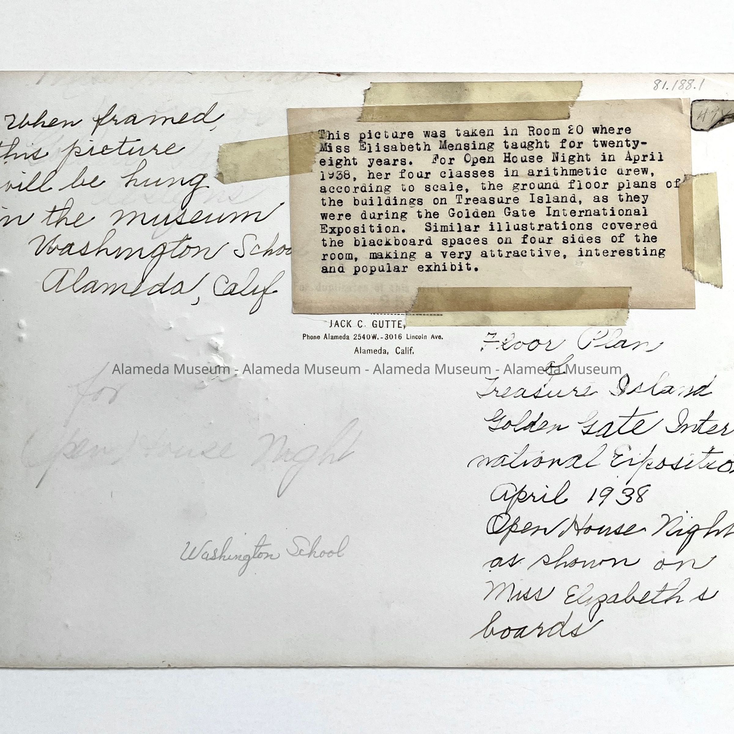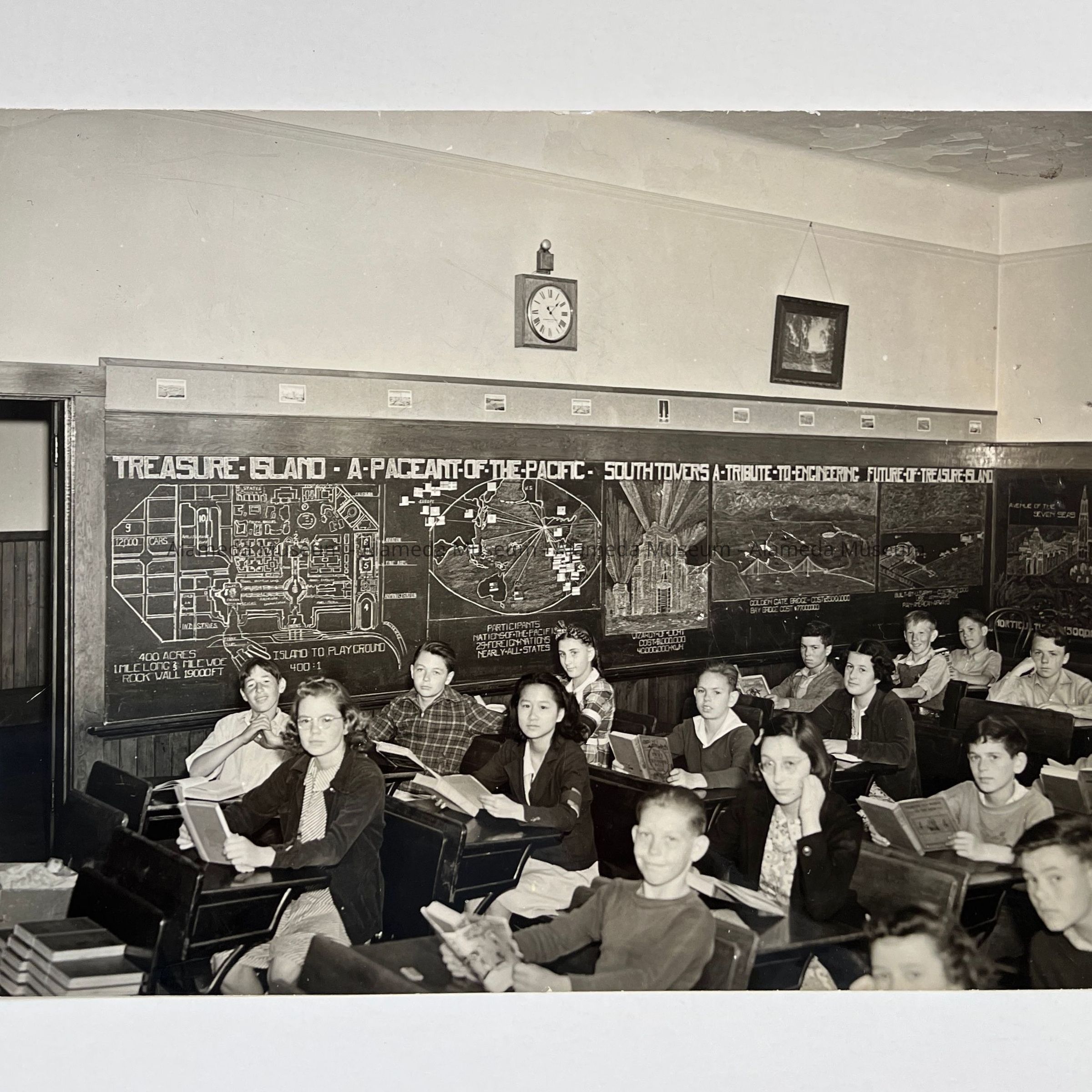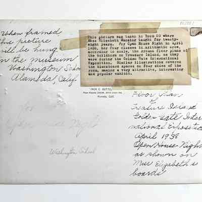 History of Object: This picture was taken in Room 20 where Miss Elisabeth Mensing taught for twenty-eight years. For Open House Night in April, 1938, her four classes in arithmetic drew, according to scale, the ground floor plans of the buildings on Treasure Island, as were during the Golden Gate International Exposition. Similar illustrations covered the blackboard spaces on four sides of the room, making a very attractive, interesting and popular exhibit.