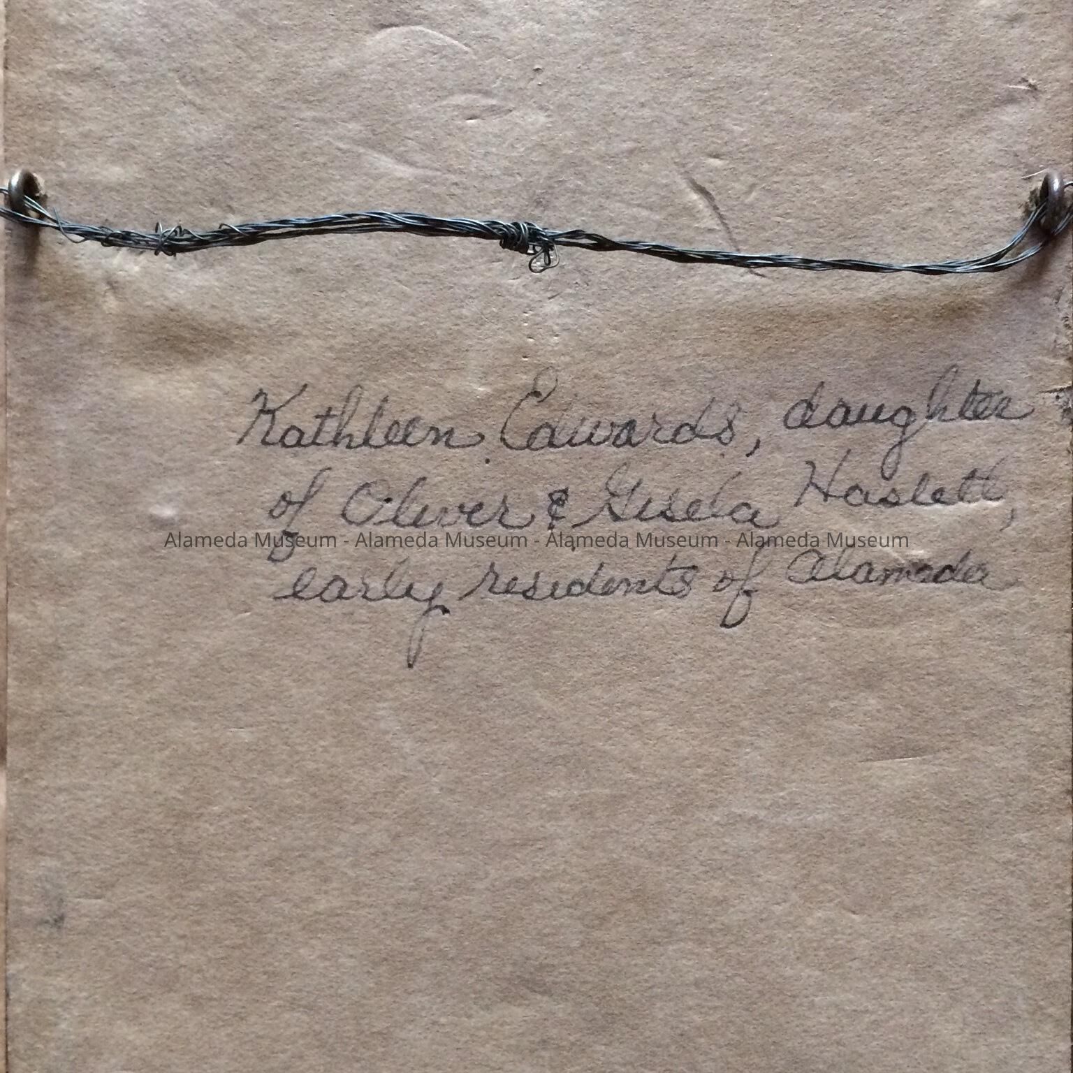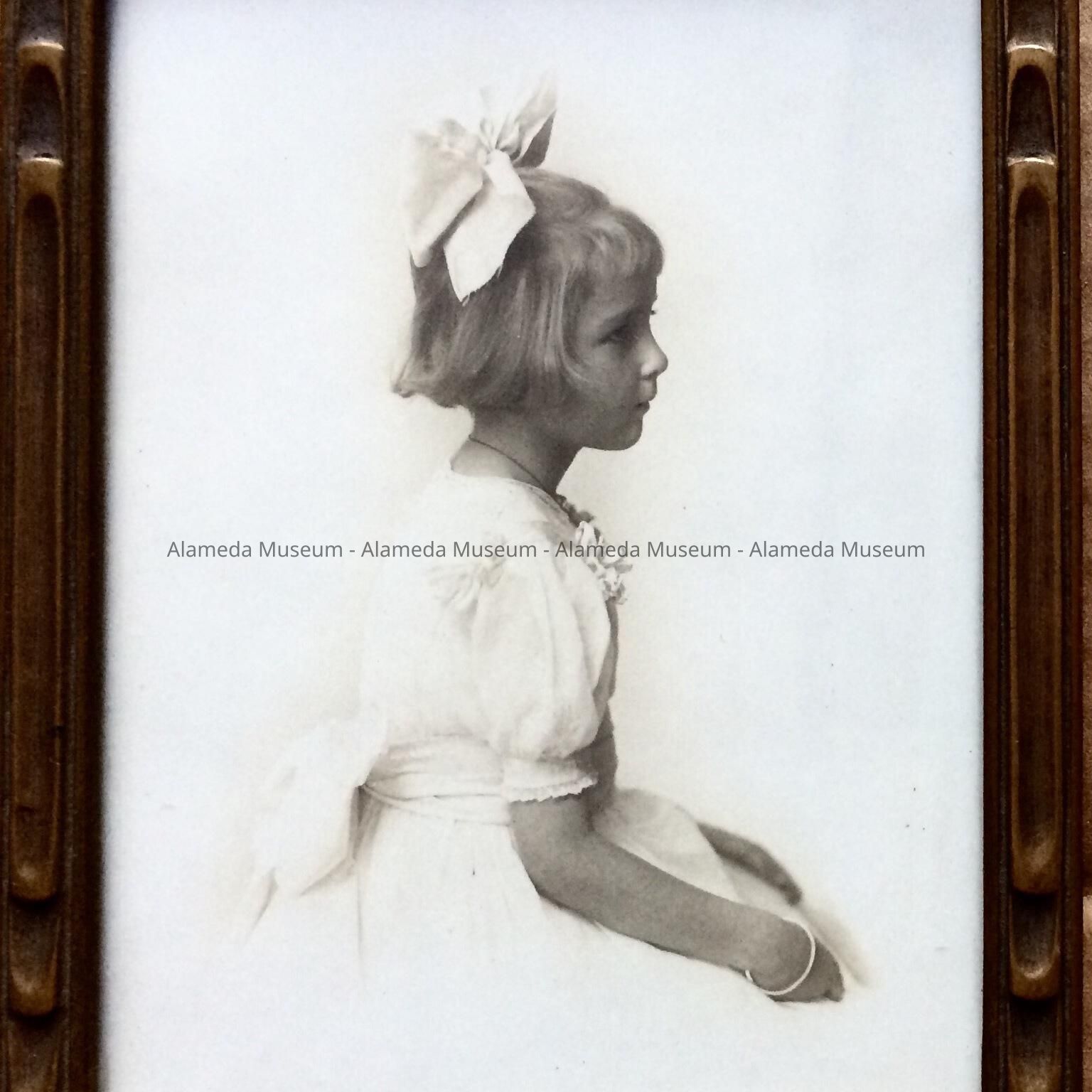 History of Object: Framed photo of Kathleen Edwards, daughter of Oliver & Gisela Haslett, early residents of Alameda.