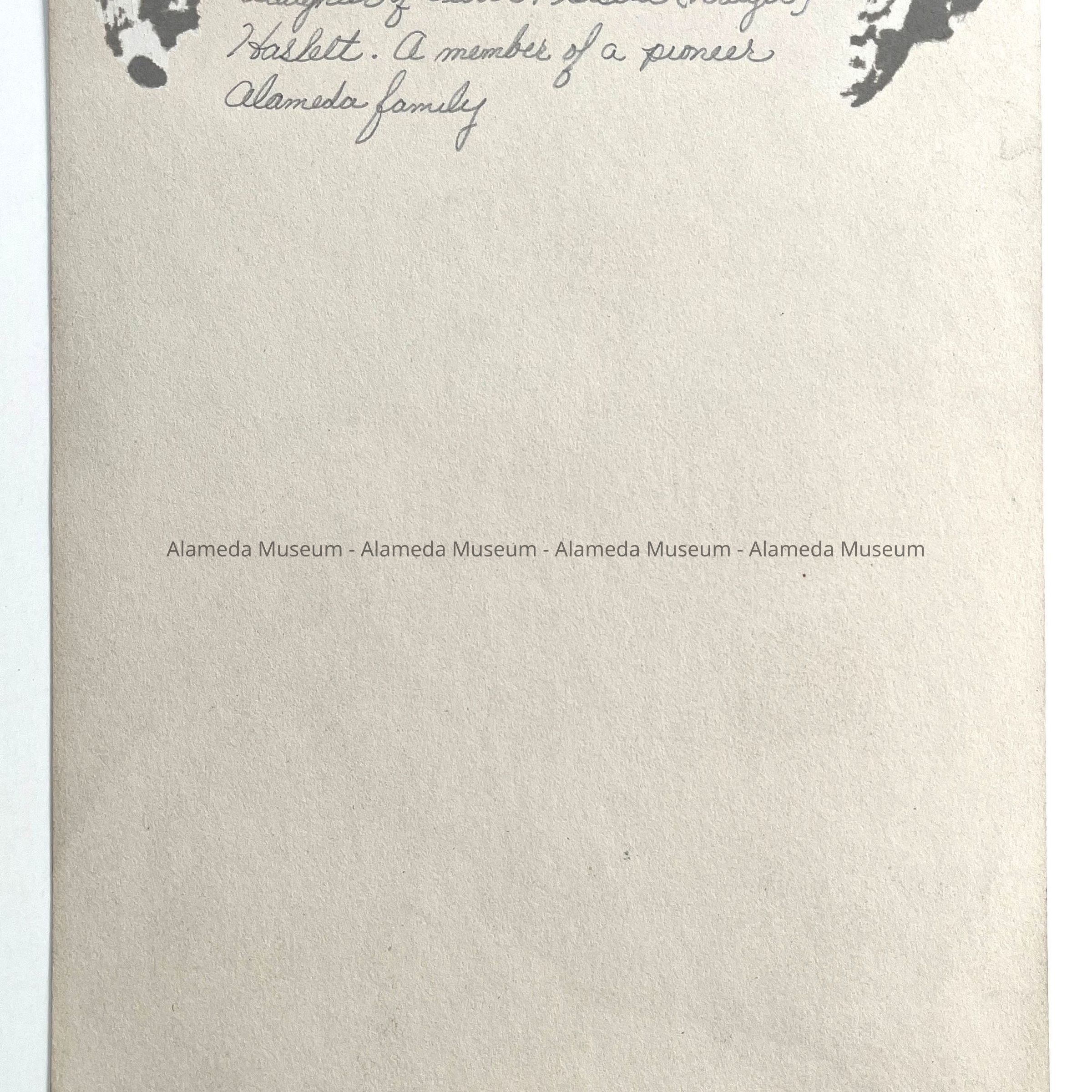 HISTORY OF OBJECT: Photograph of Kathleen Elizabeth Haslett Edwards, daughter of Oliver and Gisella Kruger Haslett, members of a pioneer Alameda family.