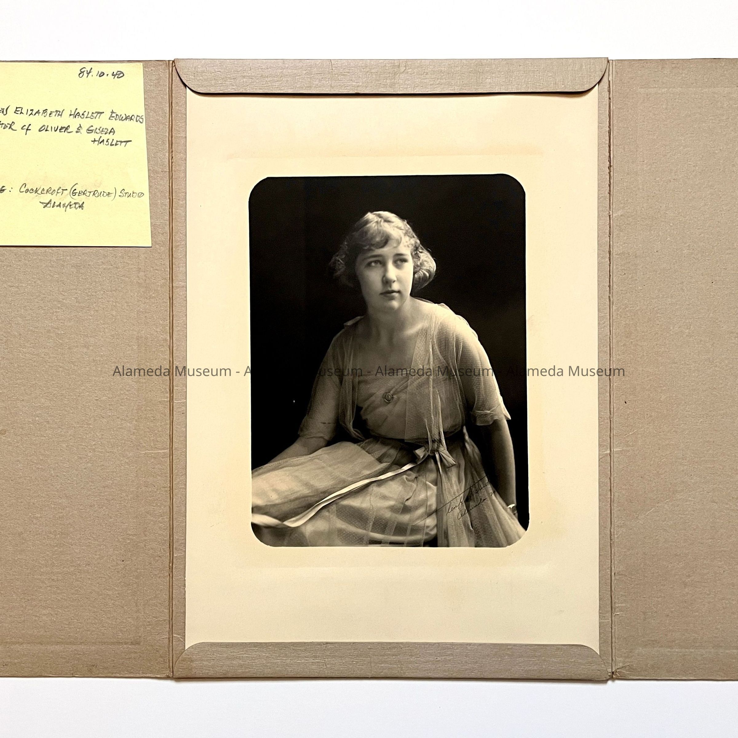 Photograph of Kathleen Elizabeth Haslett Edwards, daughter of Oliver and Gisella Haslett, members of a Pioneer Alameda family.