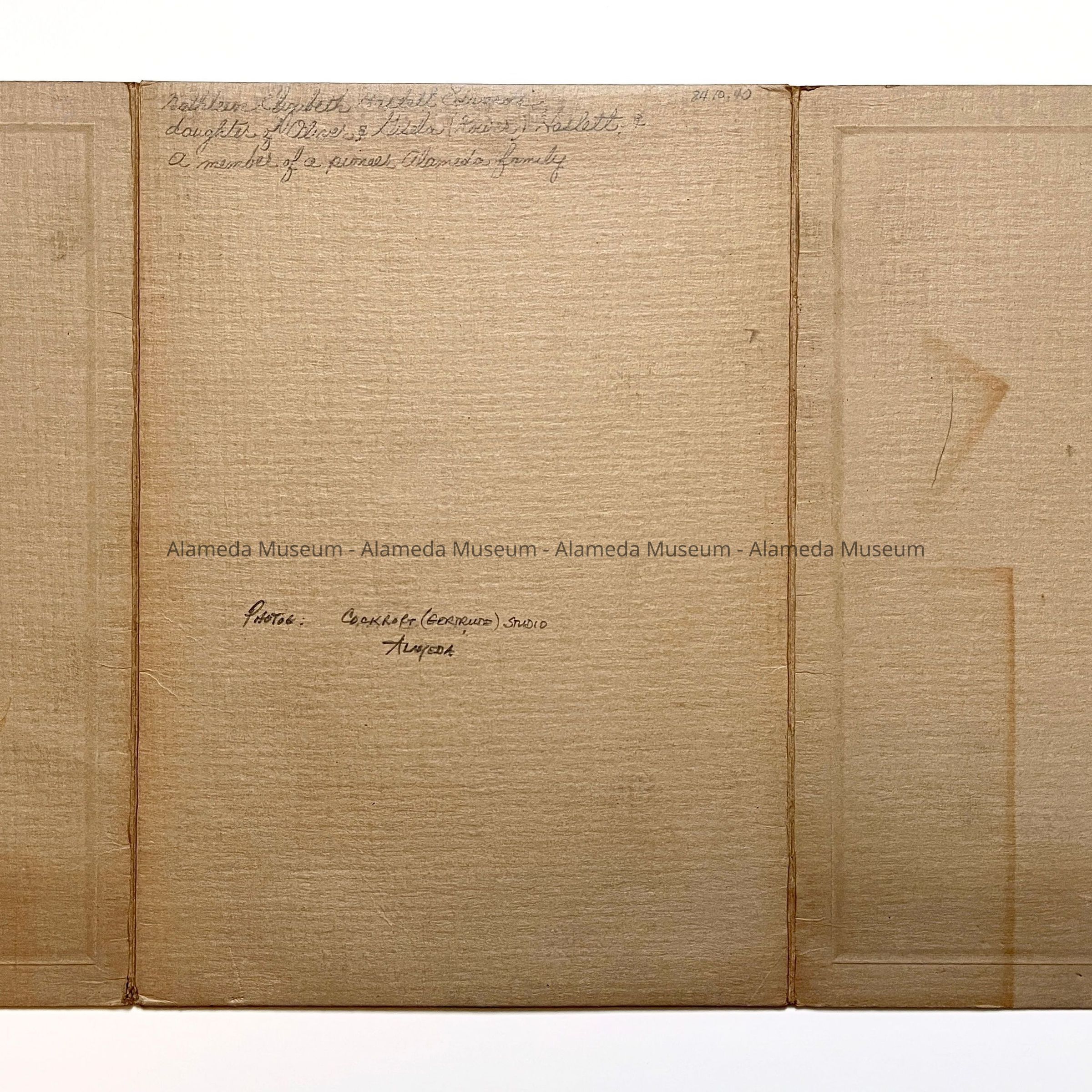 DESCRIPTION: Black and white photograph mat finish in off-white jacket. The photo is signed "Cockcroft Studio, Alameda 20".