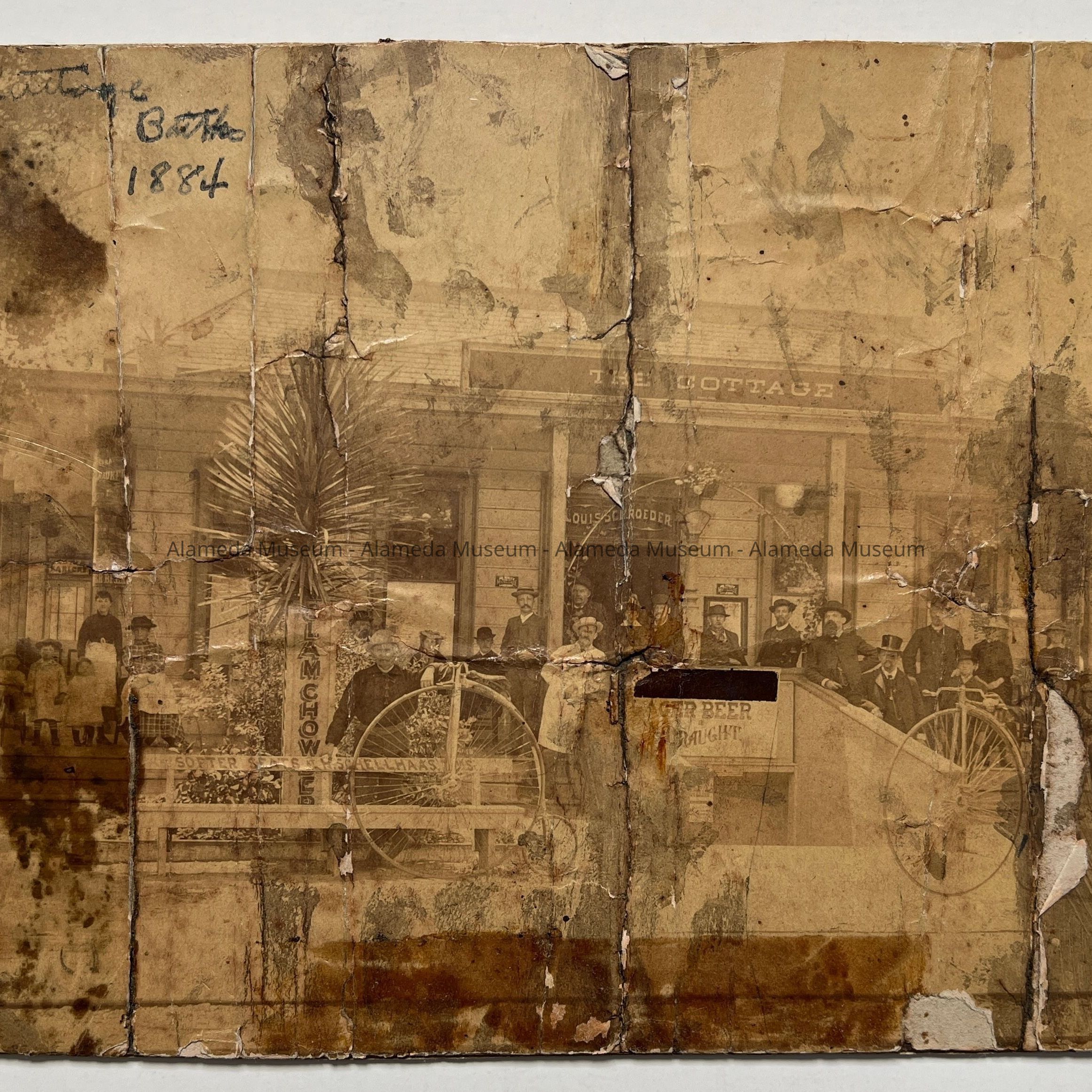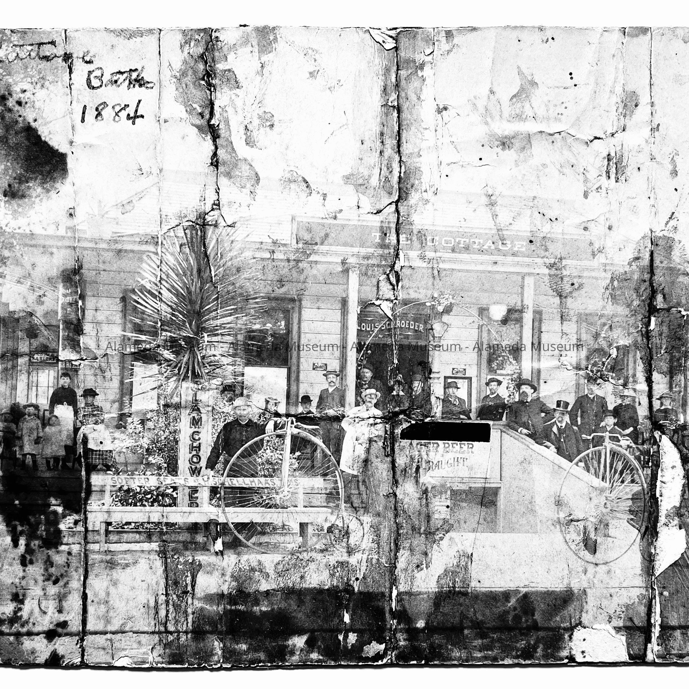 History of Object: Scene of large crowd gathered at entrance to the Cottage Baths. Noteworthy is the presence of three novelty bicycles (with giant front wheels and tiny rear wheels) parked in the foreground.