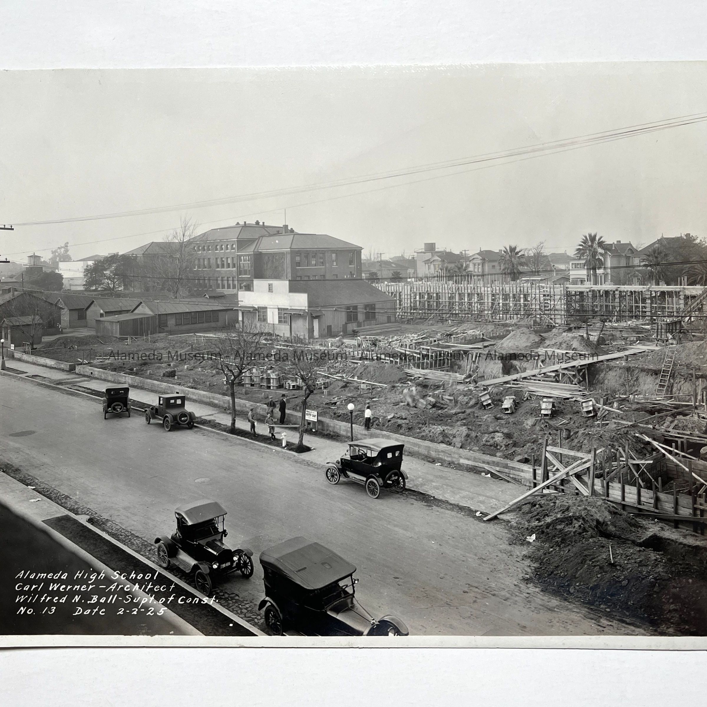 History of Object: The photograph depicts the laying of the foundation of the Alameda High School, February 2, 1925, taken from Alameda Avenue, looking toward Central. The original Alameda High School, erected in 1902 aan be seen in the distance.
