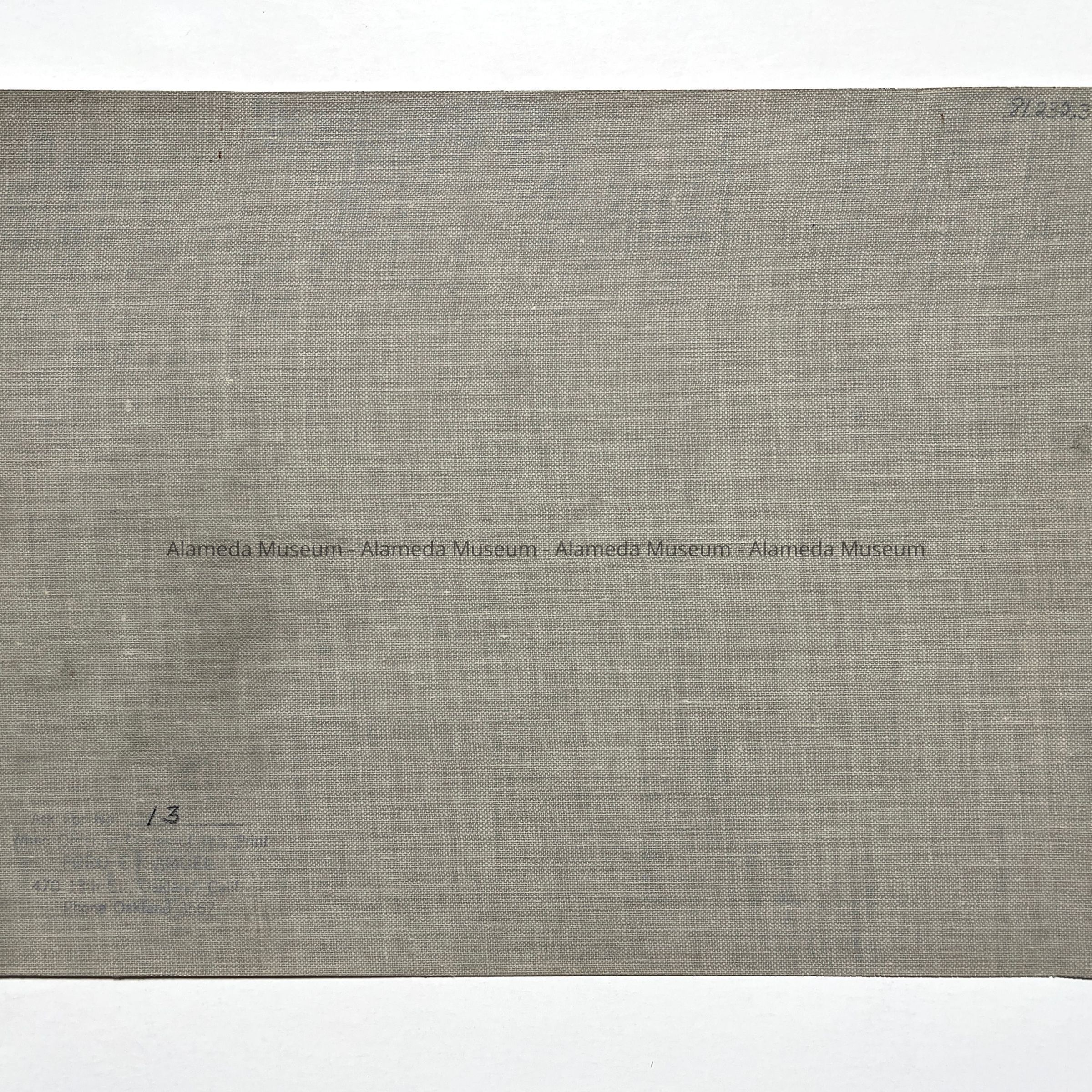 Description: Glossy photograph, mounted on canvas, at the left end is punched holes giving one the impression that it was originally in a book, On the reverse side has a rubber stamp signature stating that it is photograph #13, and done by Ford E. Samuel (later postmaster of Alameda).