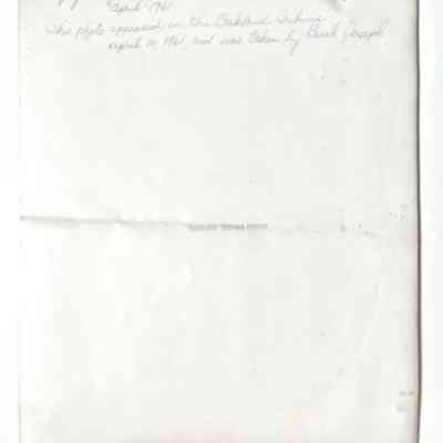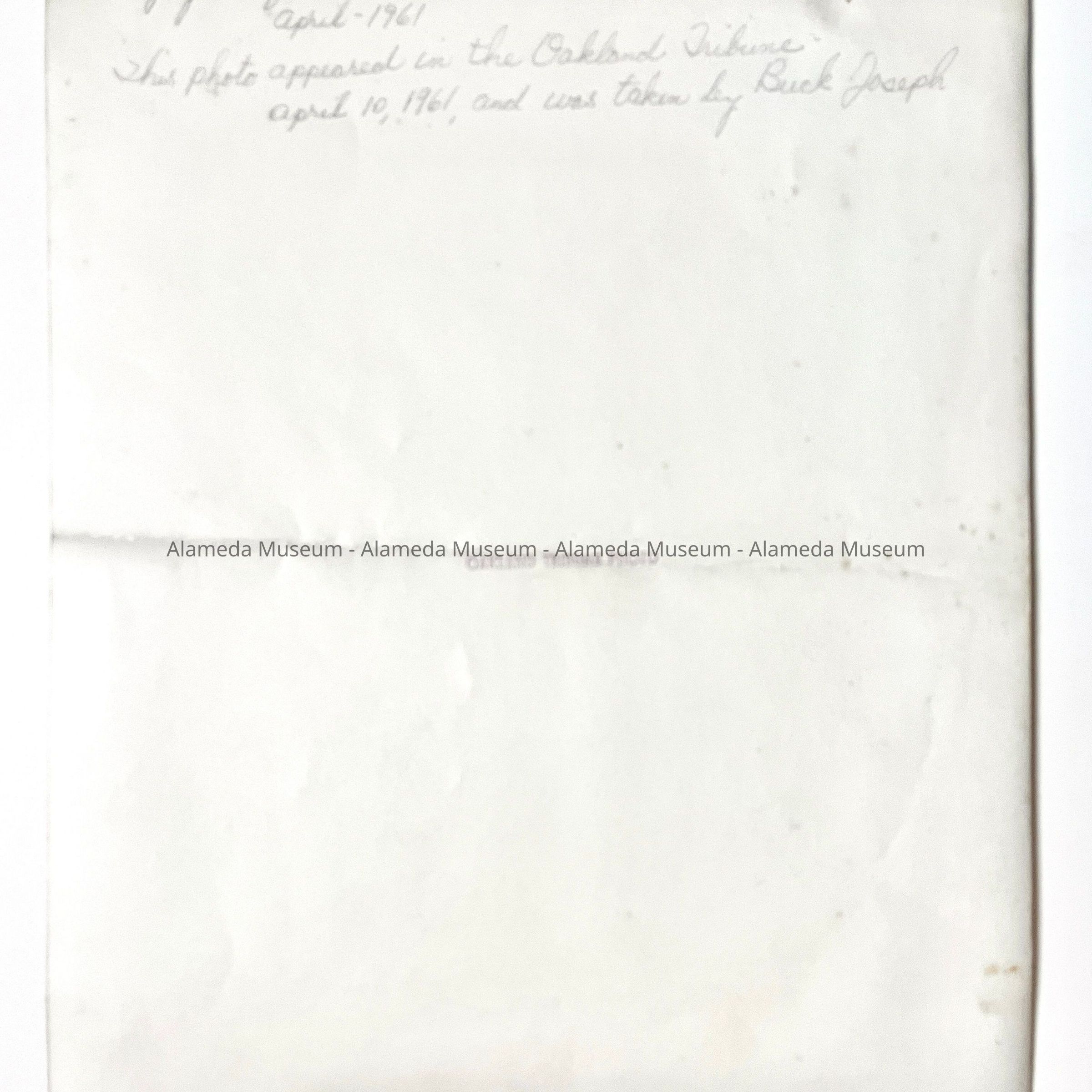 Description: Black & white glossy photo with identification on the reverse side "Oakland Tribune Photo".