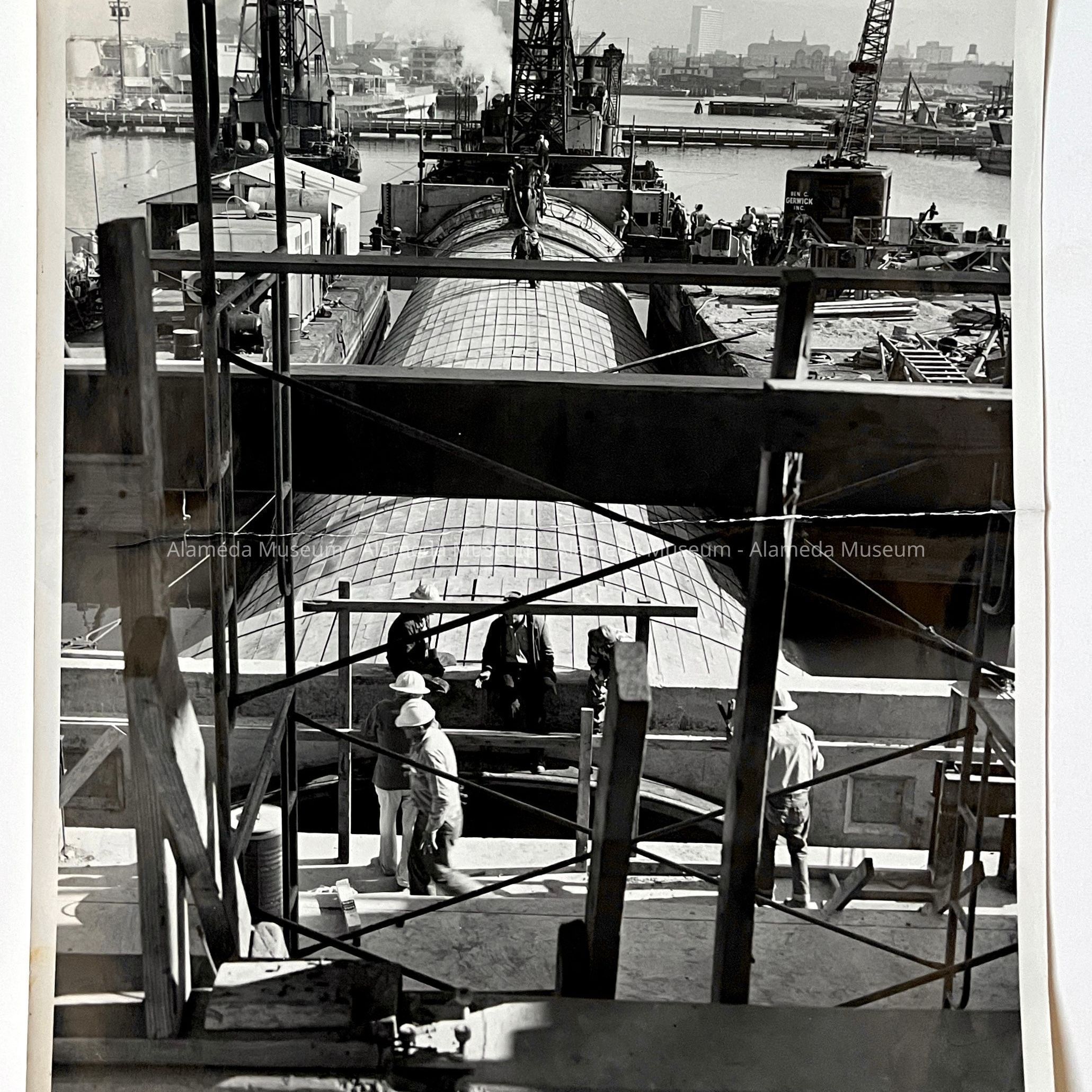 History of Object: Photograph depicting the laying of the first section of the Alameda Tube, which appeared on the front page of the Oakland Tribune, Monday, April 10, 1961. The photo was obtained by C. F. Bowdish, a printer employed by the Tribune, for his personal use.