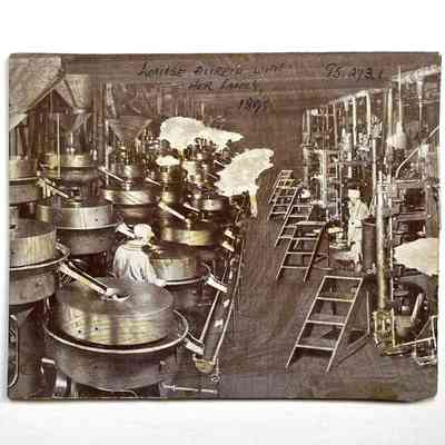 Description: Sepia-toned albumen print photo mounted on lt. yellow paperboard. Photographer unknown. Typed description label is glued to the top margin of mounting overlaying 1/2-in vertical swath across the image. Nail holes are in the mounting.