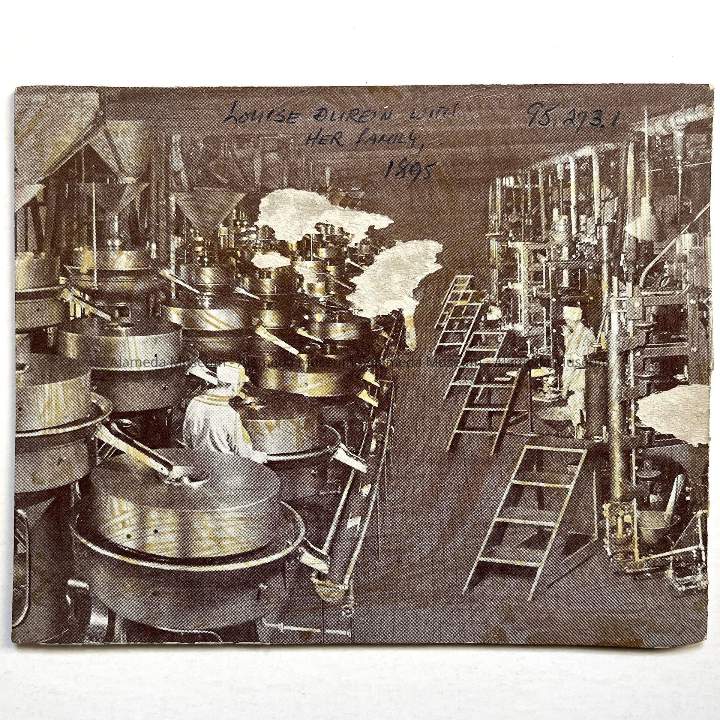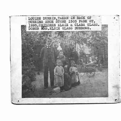 History of Object: Photo of Louise Durein with an unidentified man, and her young daughters Elsie and Clara Glass, taken in the backyard of Durein's Shoe Store at 1505 Park St., Alameda.