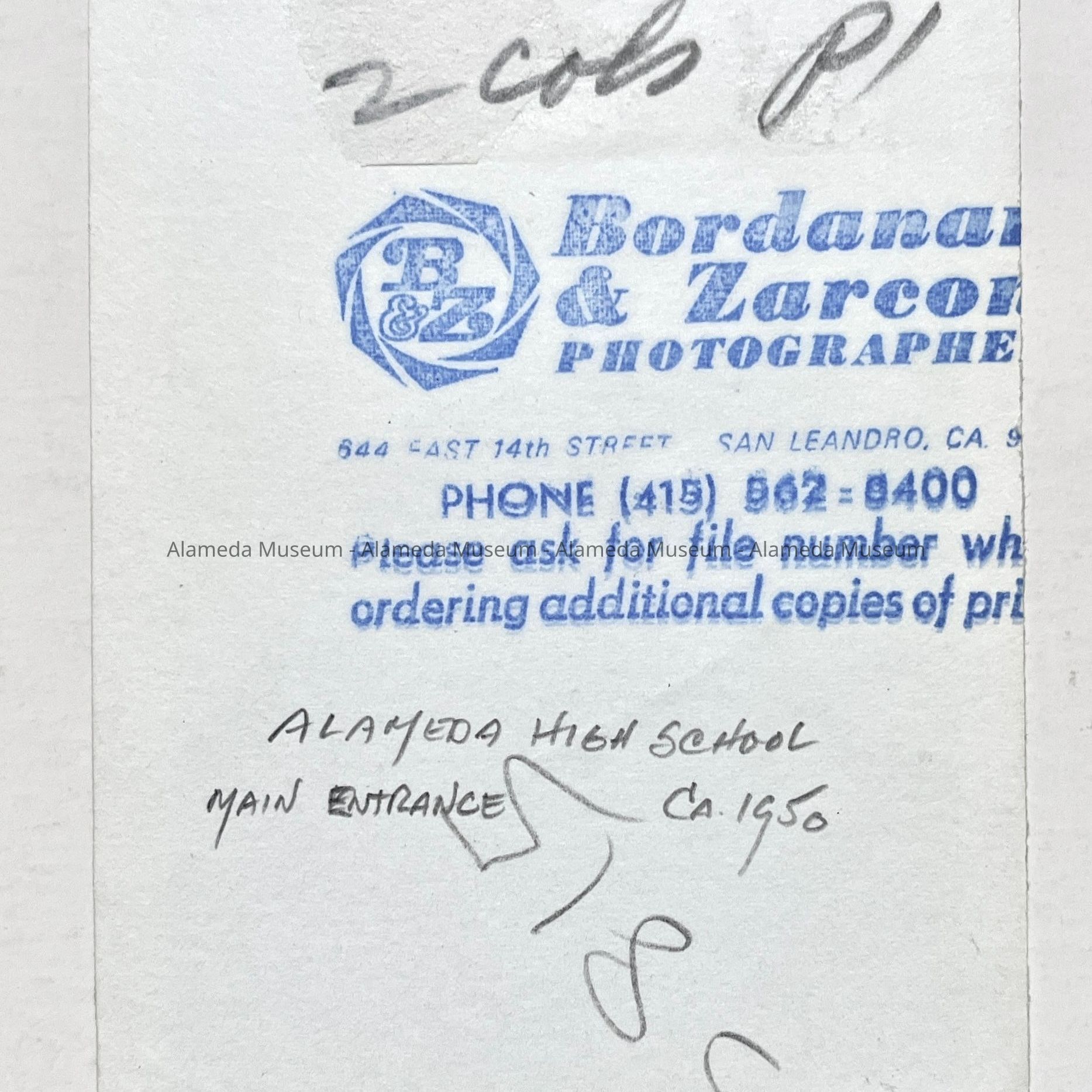 Description: Glossy black/white photo, unmounted. Photographer: Bordonas & Zorconi (?), San Leandro (per incomplete rubber stamping on verso).