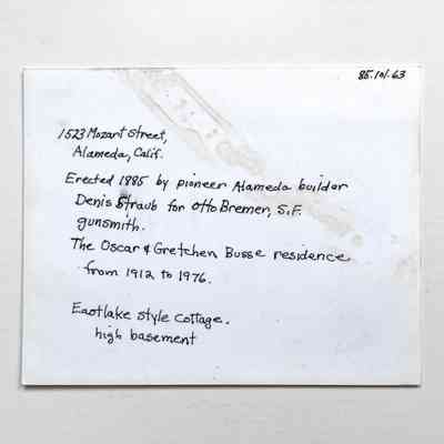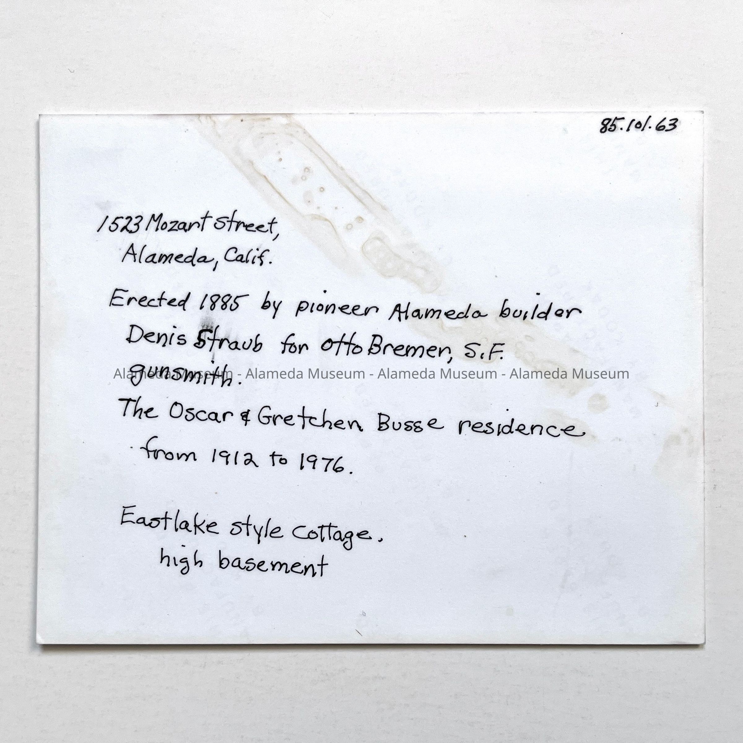 History of Object: Photo depicting the main facade of 1523 Mozart Street, Alameda. The Busse family residence from 1912 to 1976.