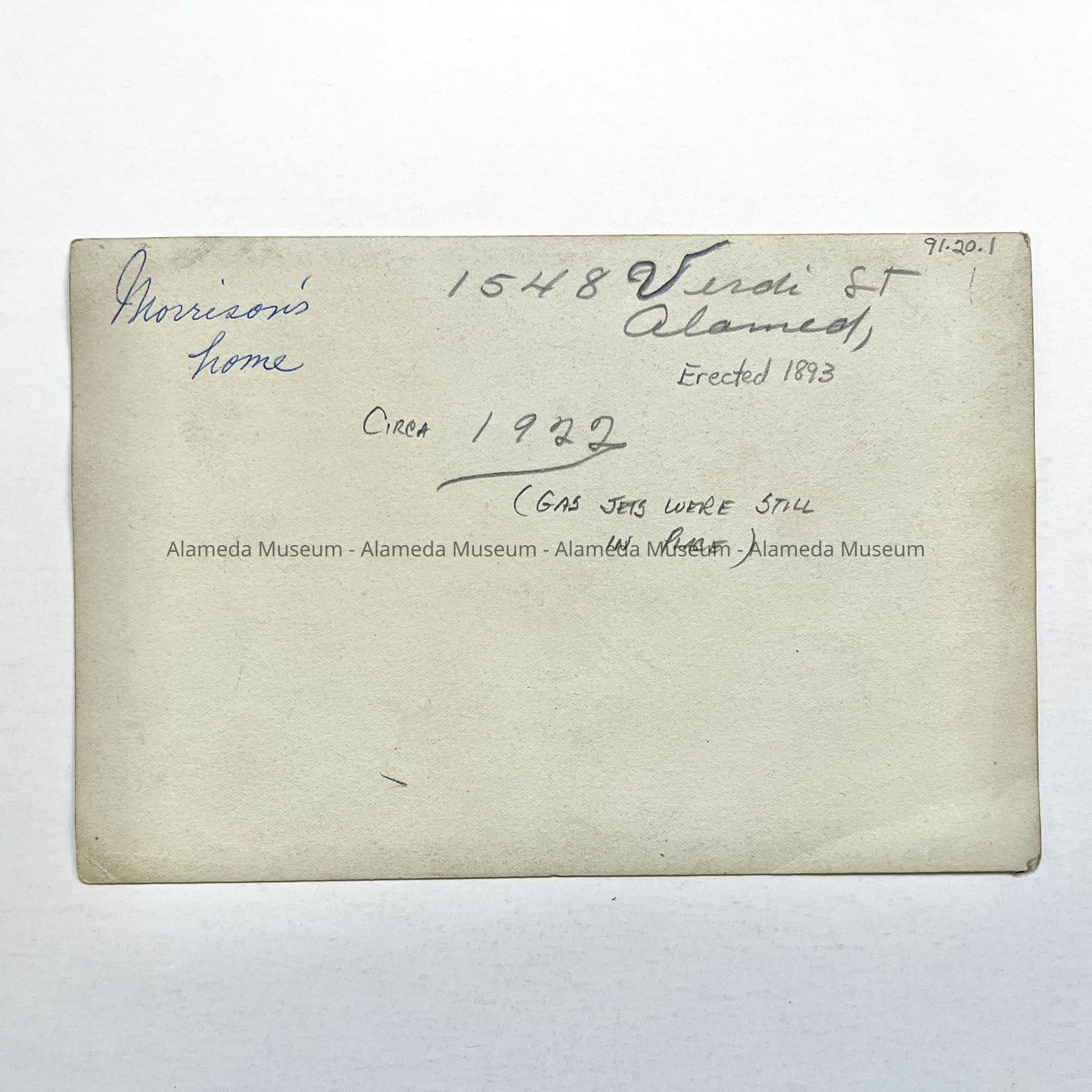History of Object: Photograph depicting main facade of 1548 Verdi Street, erected 1893 by Marcuse and Remmel. Photograph taken 1922 when it was the home of the Morrison family.