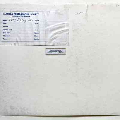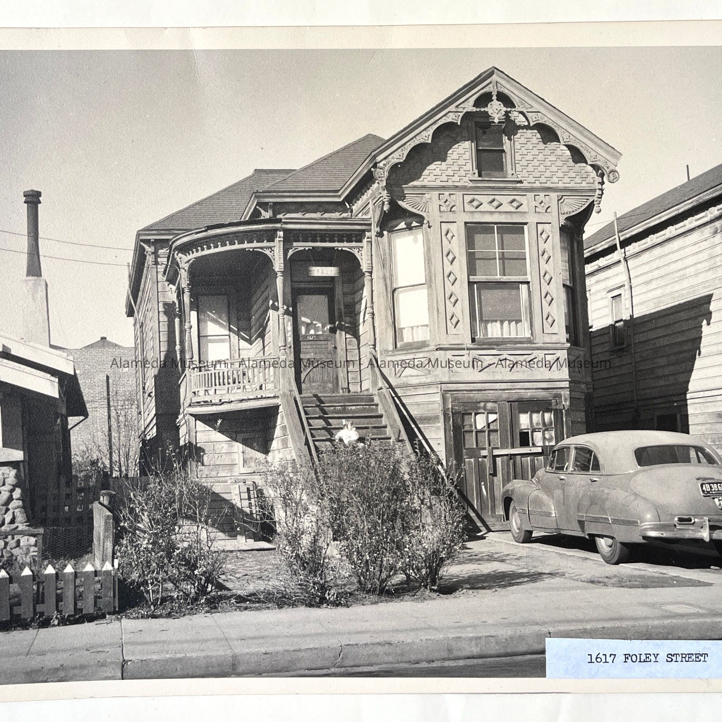 Photograph of the main facade of a Queen Anne style cottage with a high basement at 1617 Foley, now demolished. The photograph was taken by Harriet Hallonquist, a member of the Alameda Photographic Society.