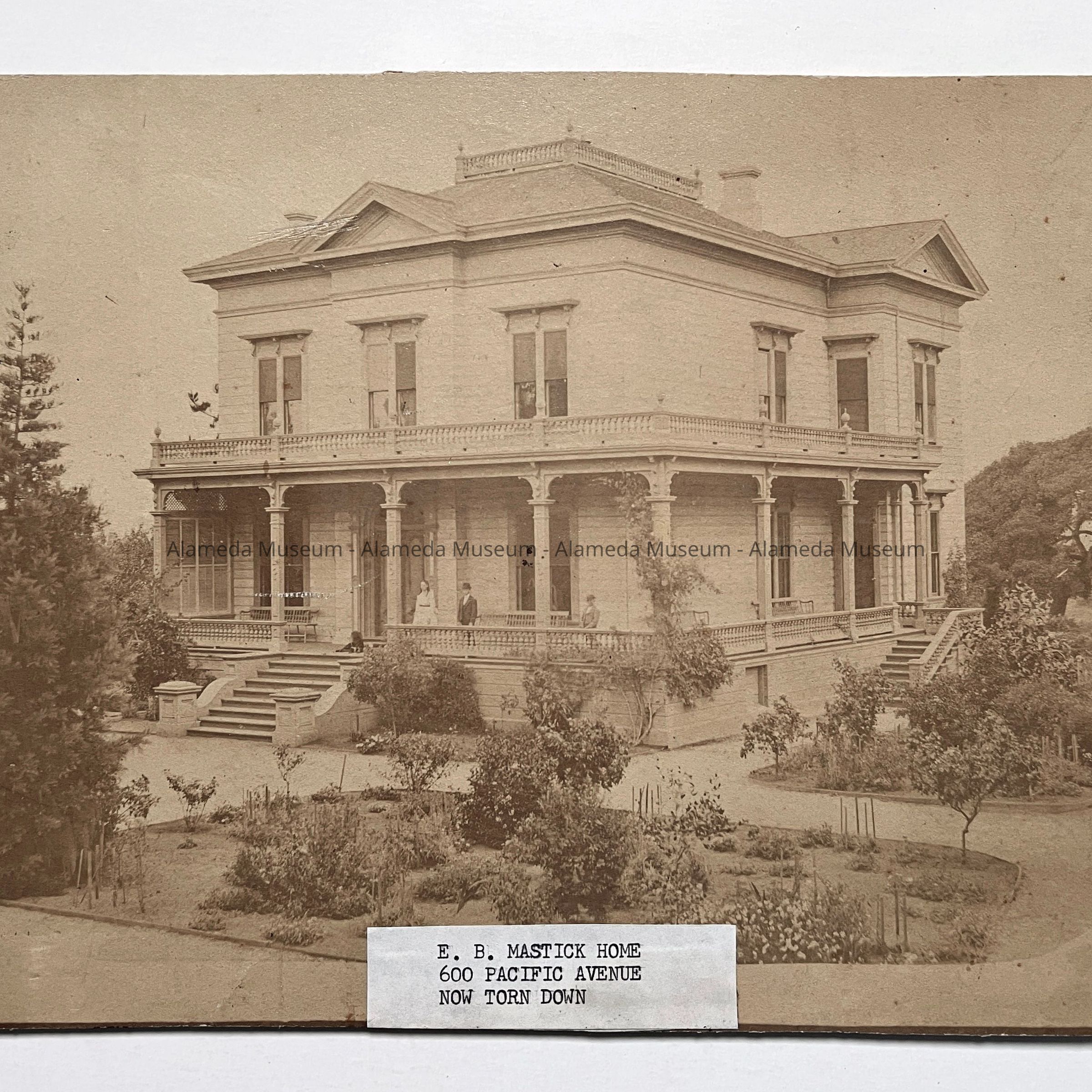 History: Photograph depicting the main facade and grounds of Edwin Mastick's home on Pacific Avenue, now demolished. The Mastick School is named in his honor. The photograph is part of an original collection at the Alameda Historical Museum and was donated prior to 1971.
