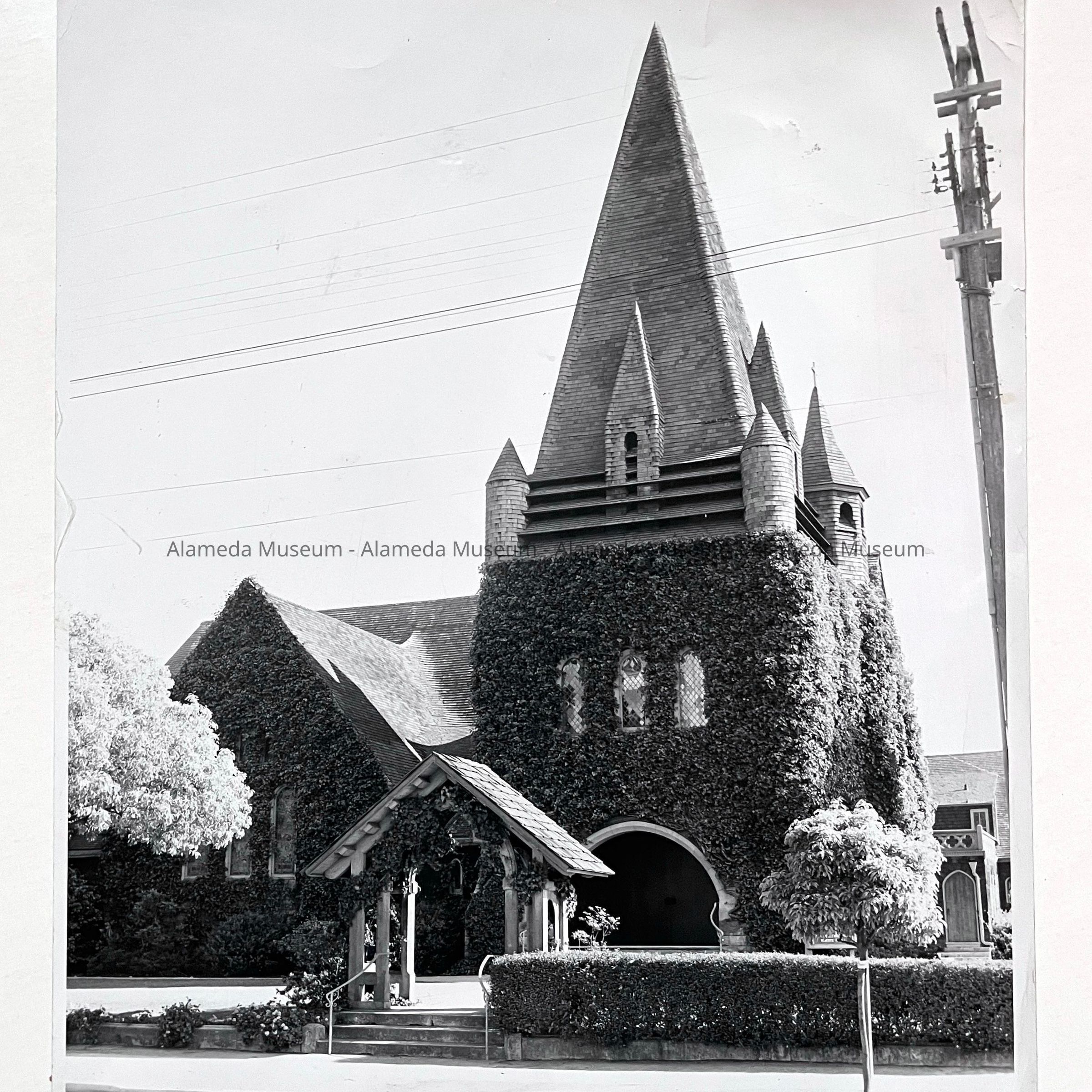 PHOTOGRAPH DEPICTING THE IVY-CLAD MAIN FACADE OF THE CHRIST EPISCOPAL CHURCH WHICH WAS DESTROYED BY FIRE (CIRCA 1961).