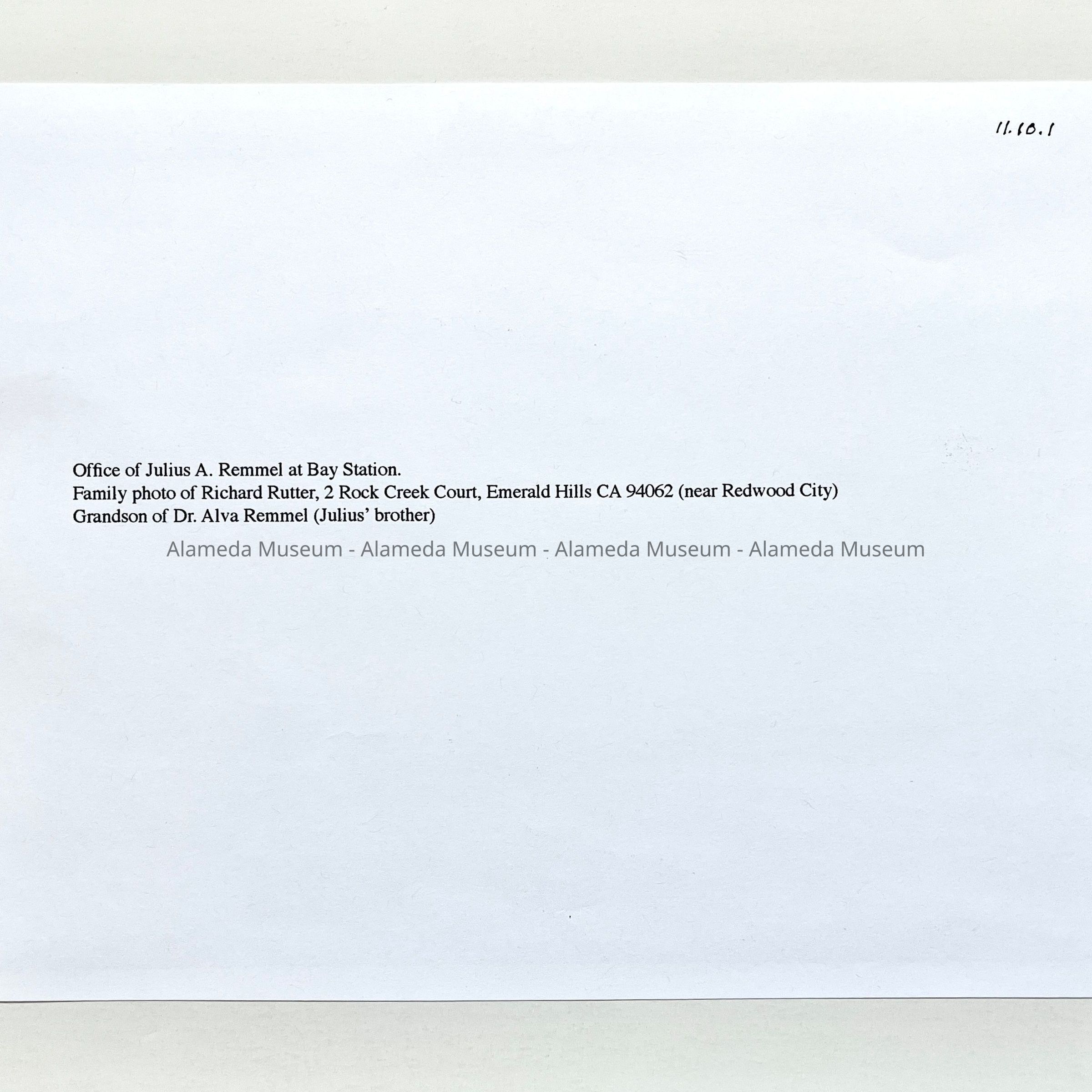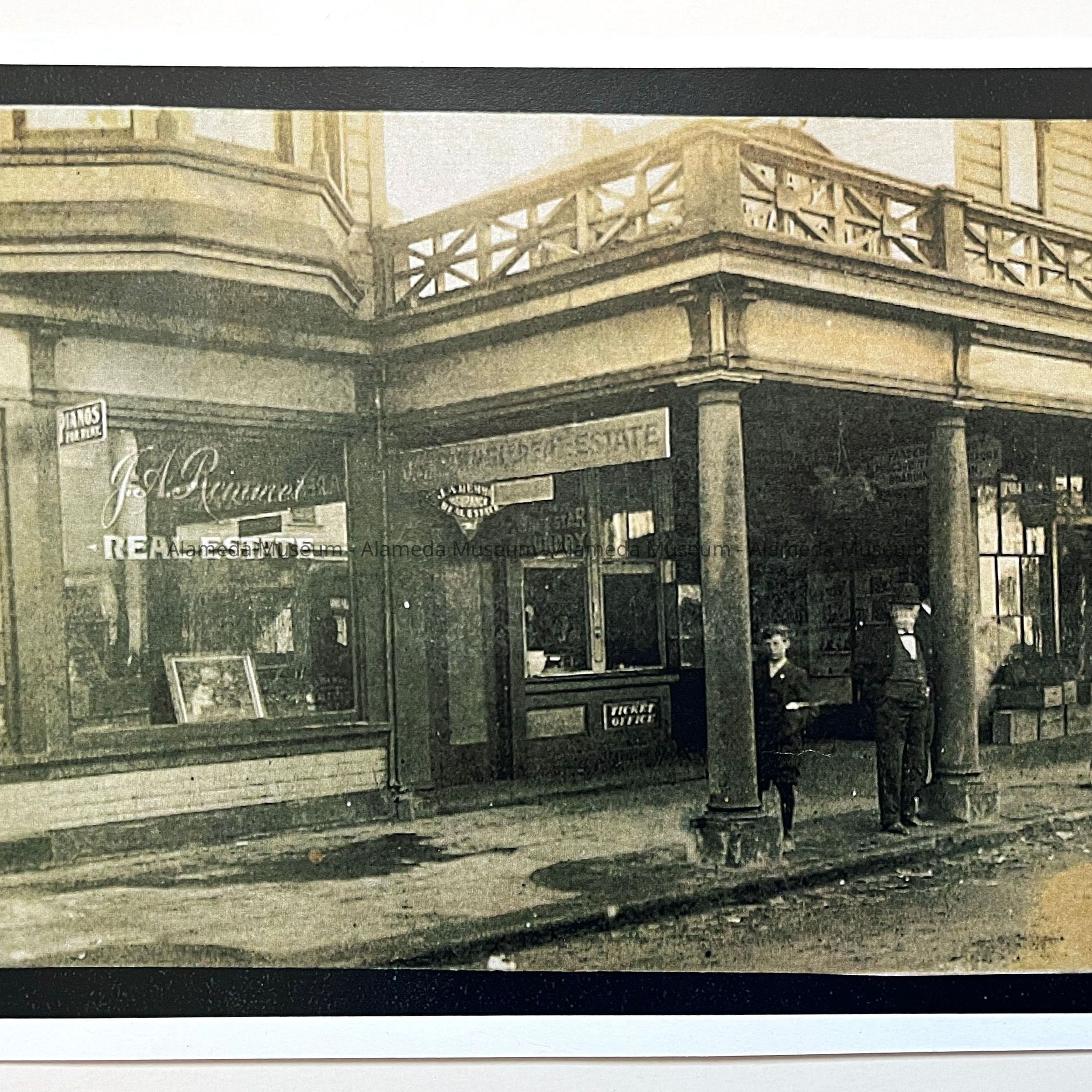 Description: View of the main facade of the real estate office of Julius A. Remmel, at Bay Station, Lincoln Avenue, Alameda. To the right of the building is pictured the balustraded shelter and railroad ticket office of the Southern Pacific Railroad. The donor of this image is the grandson of Dr. Alva Remmel (Julius' brother).