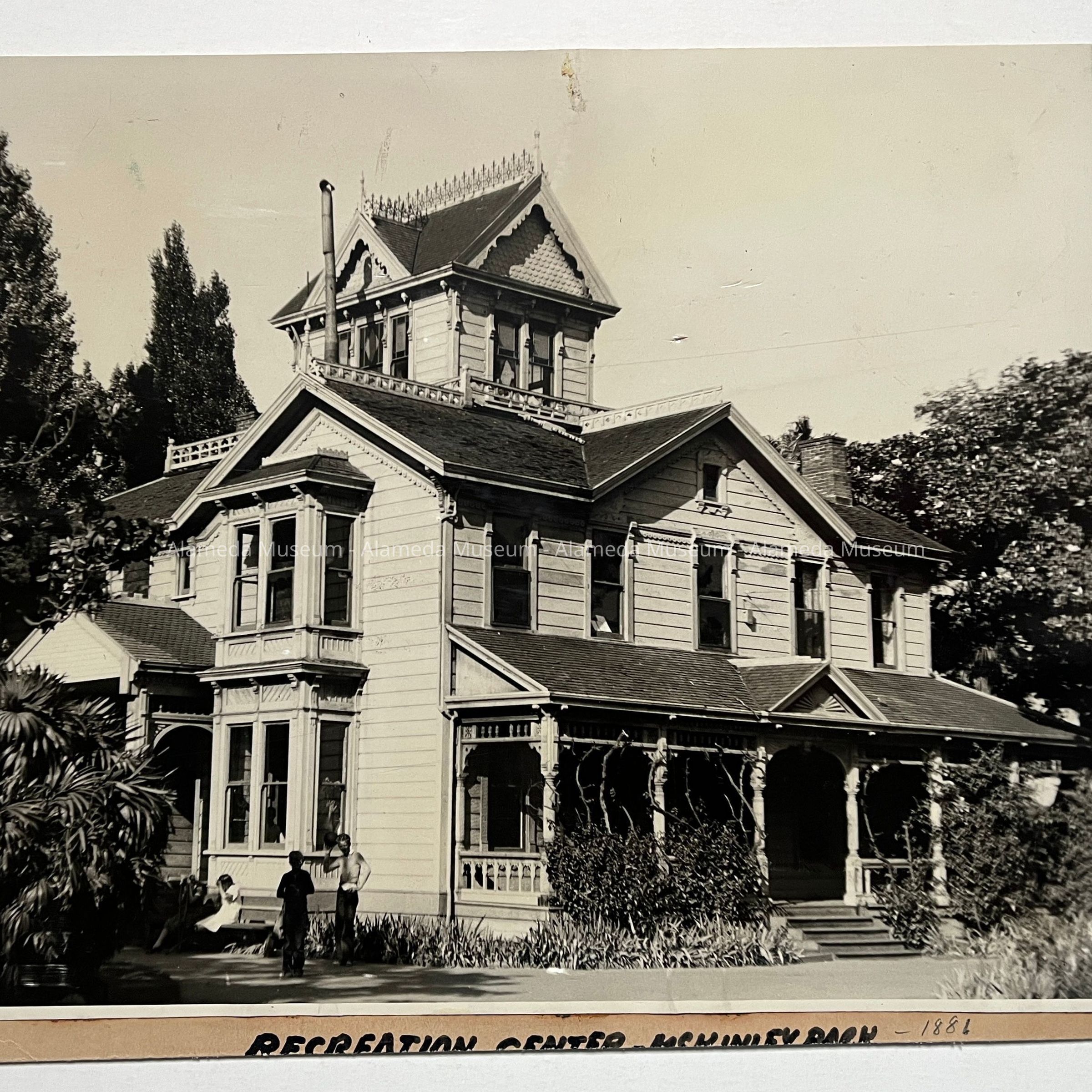 History: Photograph depicting the main facade of the James A. Waymire residence, which served as a recreation center prior to its demolition, in McKinley Park on Buena Vista Avenue.