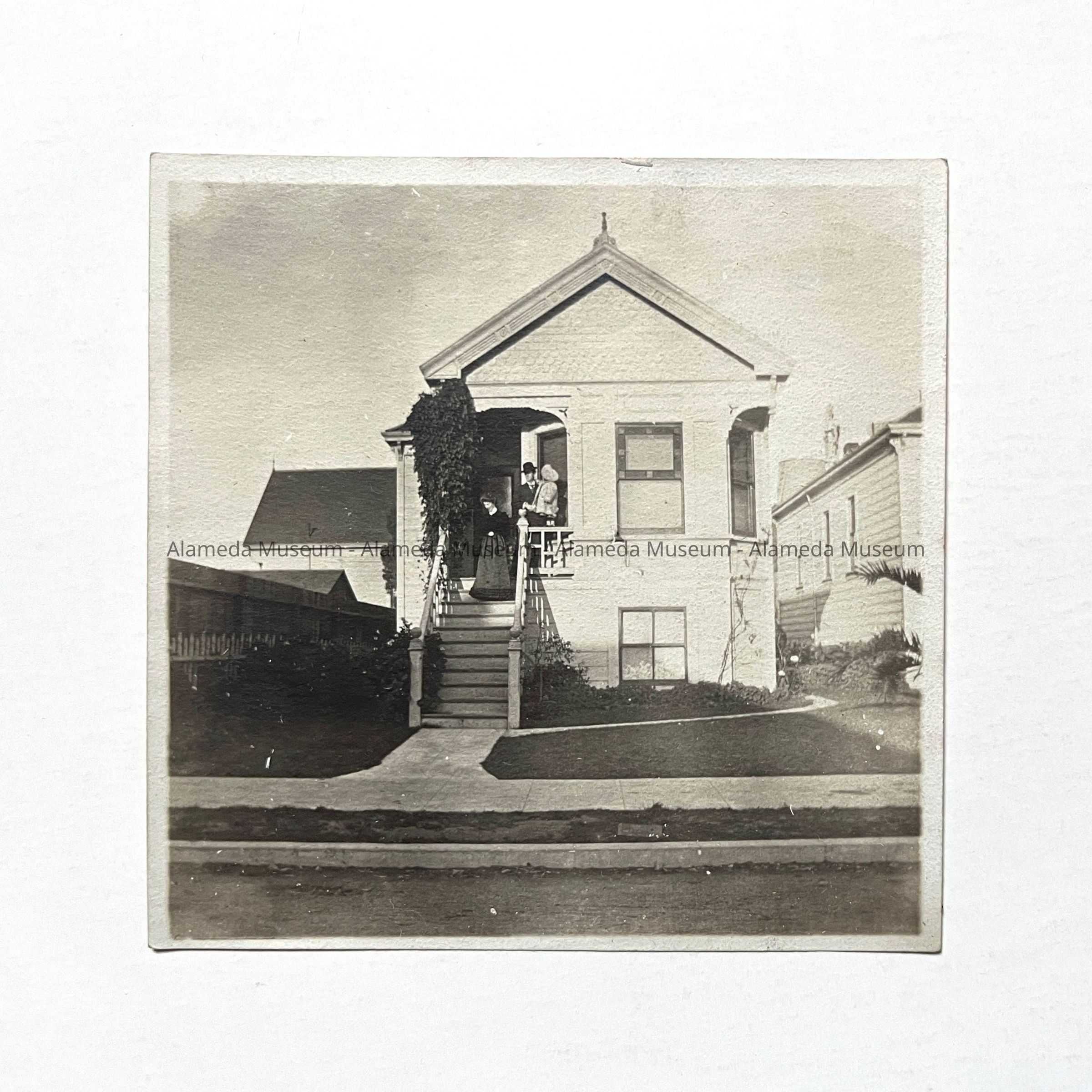 Photo of a Queen Anne cottage, high basement, 1805 Eagle avenue, Alameda, photographed around 1904. People pictured on front porch unknown. Then house was known to have been occupied by the Meacham family during this period.