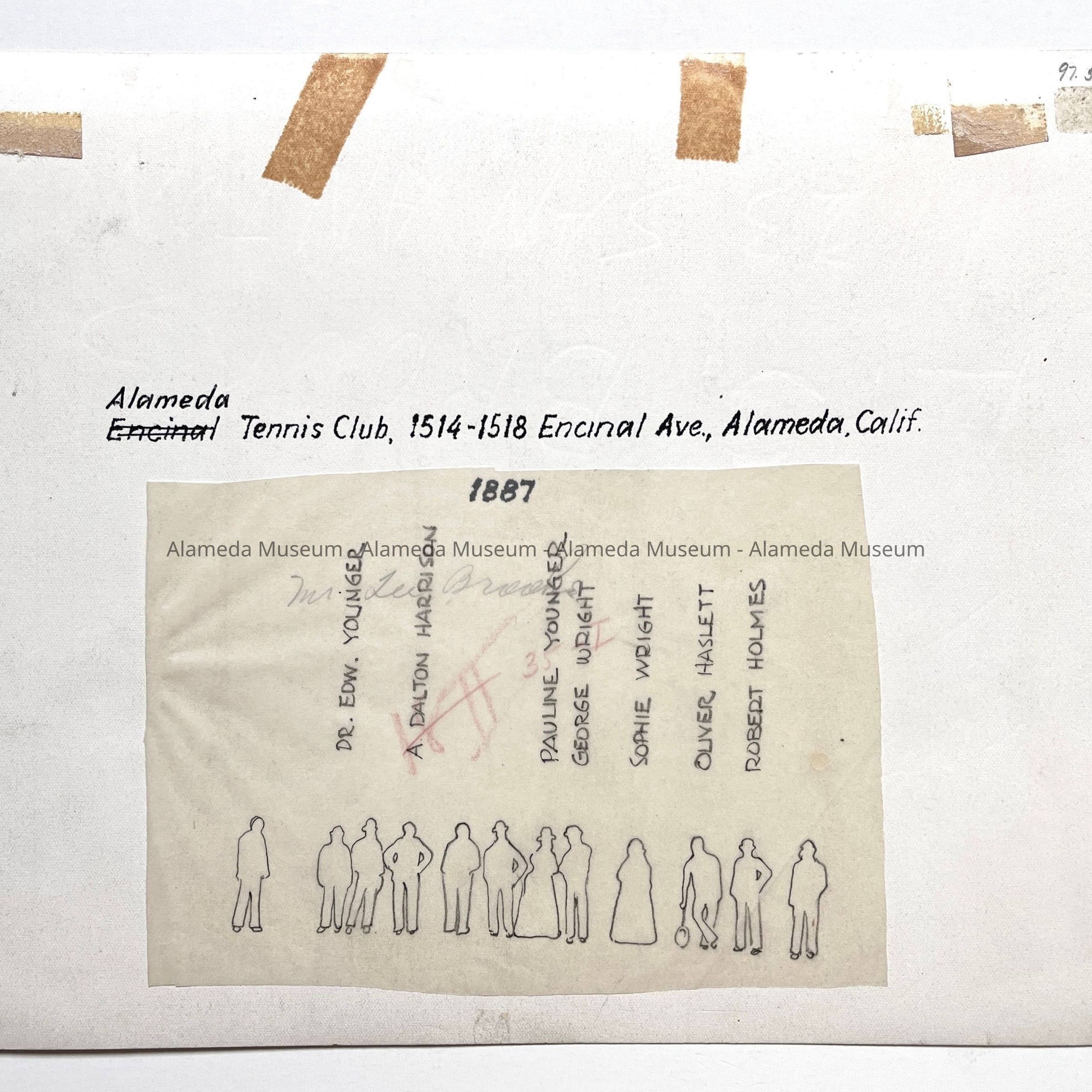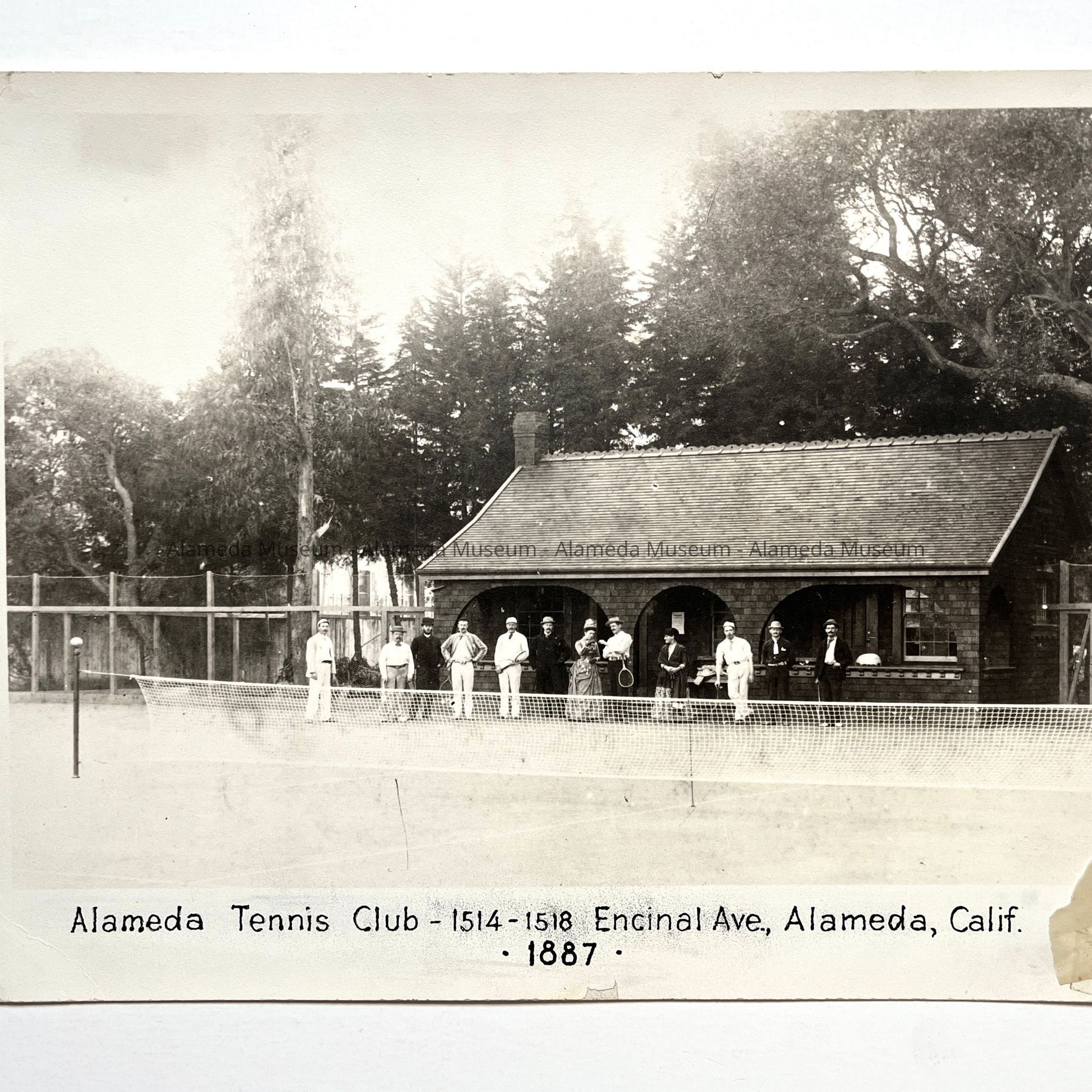 History of Object: Alameda Tennis Club members posed in front of the club house on Encinal Avenue, with the court netting shown in the foreground.