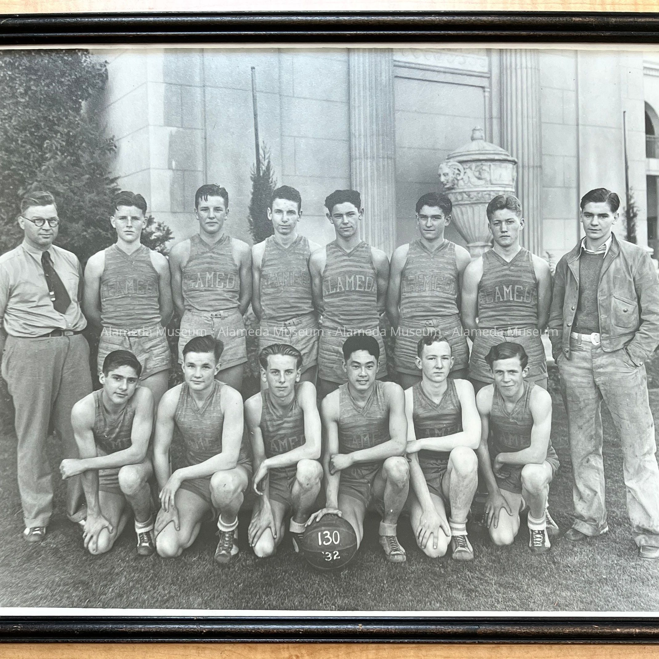 Framed photograph of the members & coach (Lewis C. Jolley), Alameda High School basketball team, 1932. Some members have signed on the back.