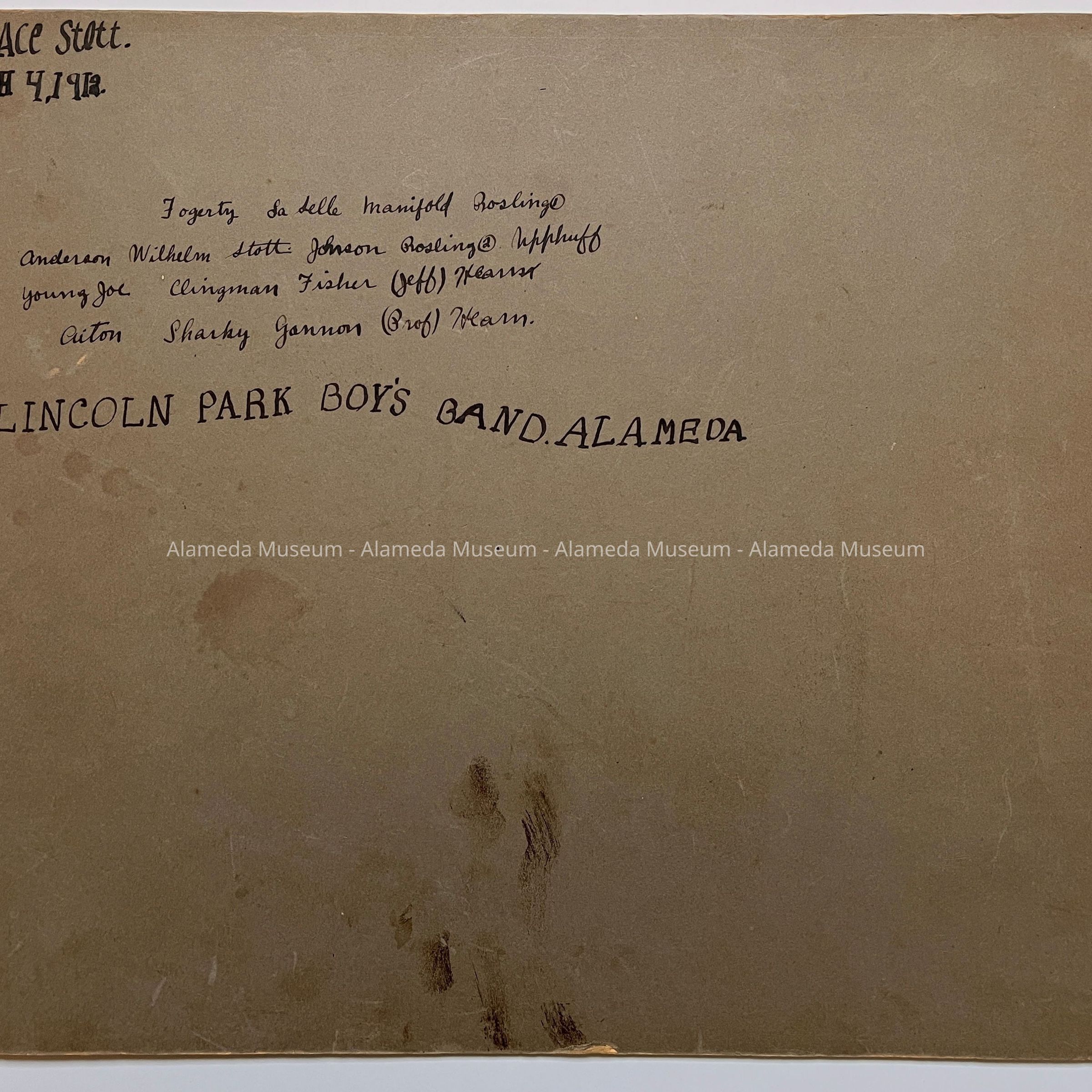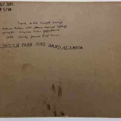 History of Object: Members of the Lincoln Park Boy's Band are depicted in this photograph standing on the steps of the old Lincoln School (erected 1891, destroyed by fire 1924).