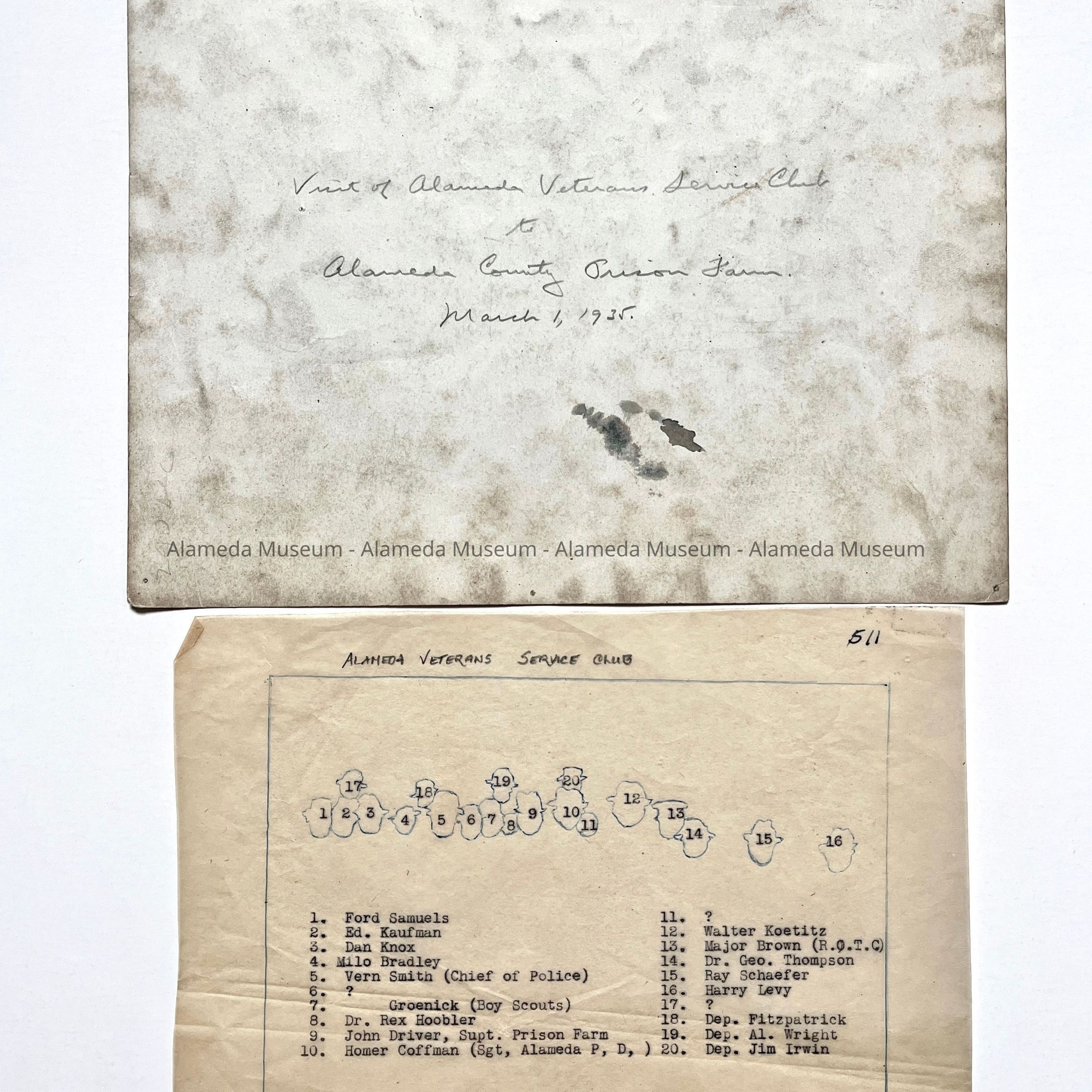 History of Object: Members of the Alameda Veterans Service club on a vist to the Alameda County Prison Farm, March 1, 1935.