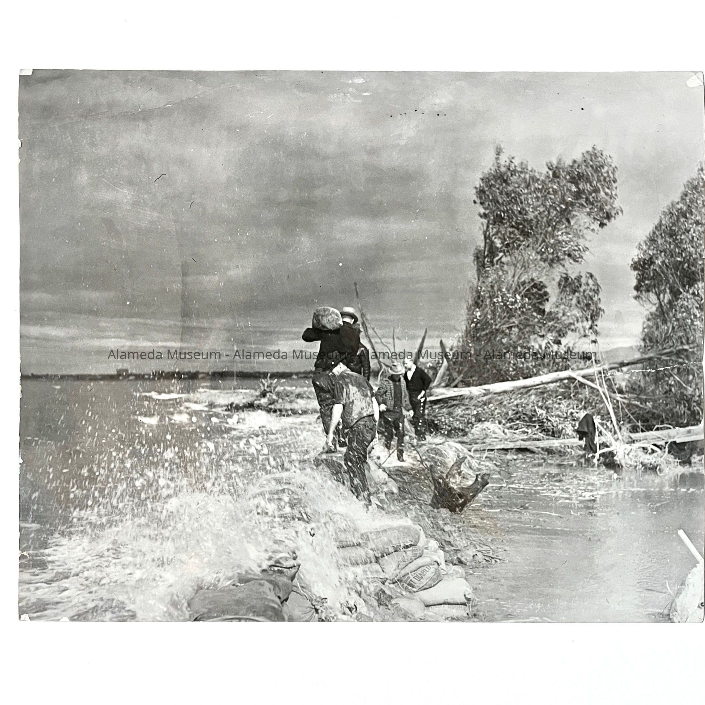 History of Object: Scene of a group of men sandbagging an undeveloped stretch of shoreland from a possible tidal wave, thought to be on Bay Farm Island.