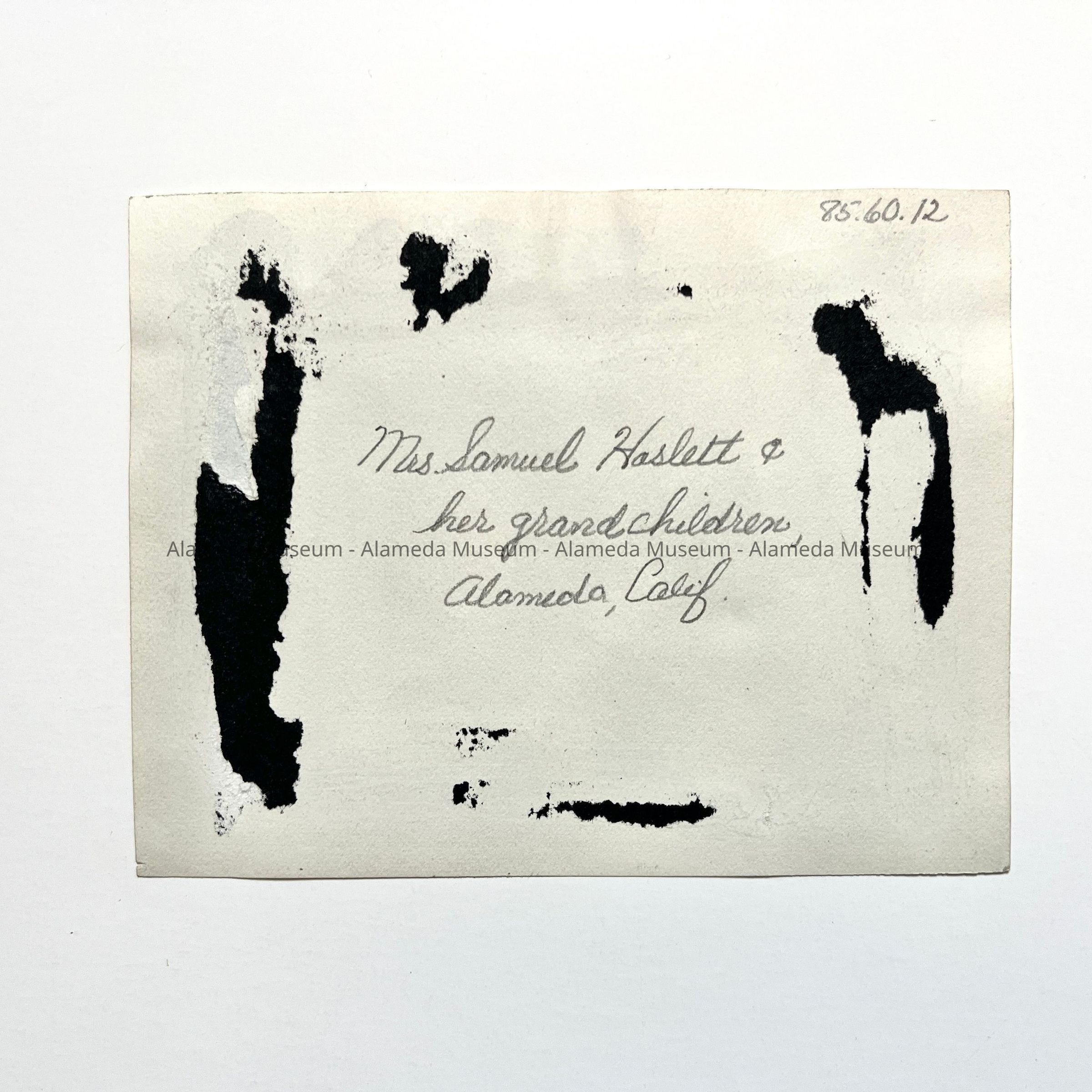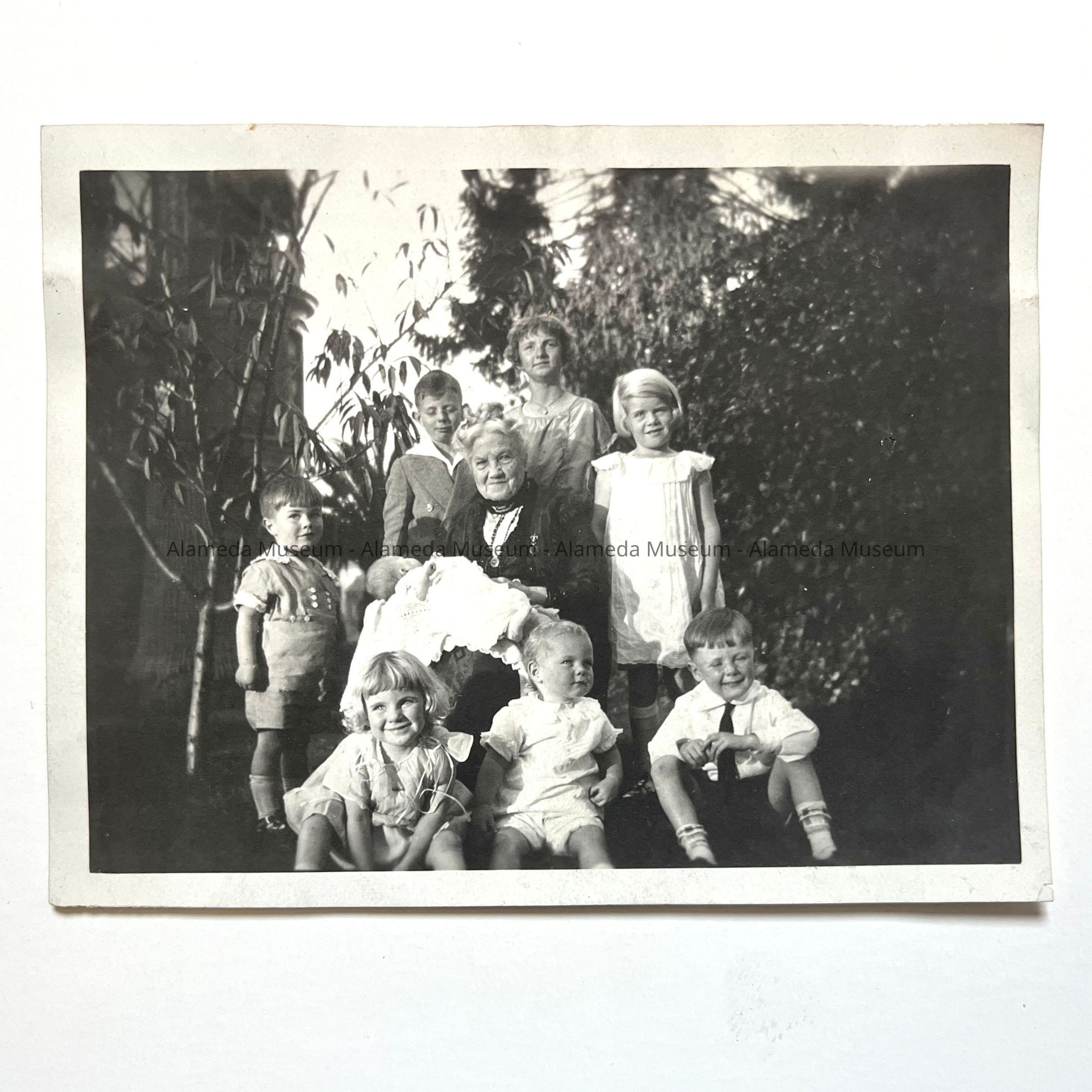 History of Object: Photo of Mrs. Samuel Haslett and her grand & great grandchildren, Alameda, Calif. The Haslett family settled in Alameda in the 1870's.