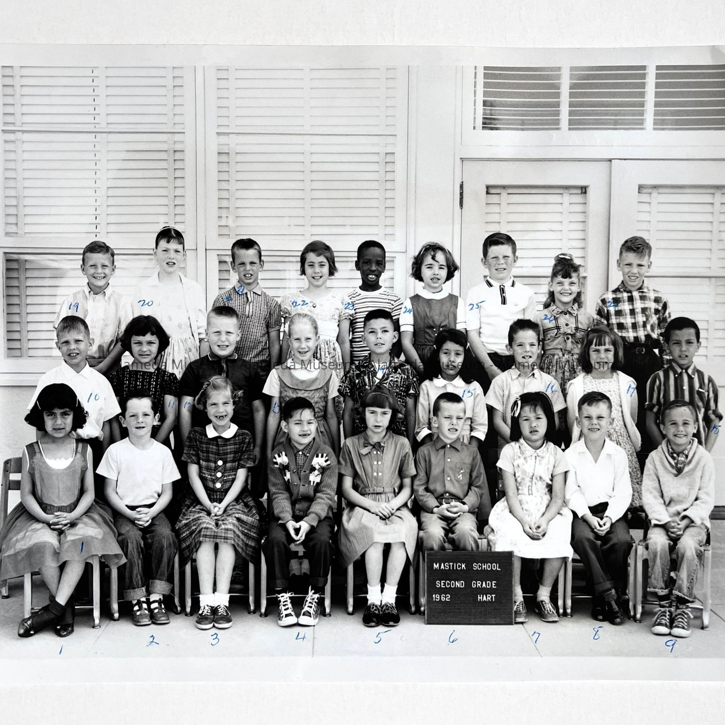 PHOTOGRAPH OF THE SECOND-GRADE CLASS, MASTICK SCHOOL, ALAMEDA, CA. HAZEL HART WAS THEIR TEACHER. 1962.