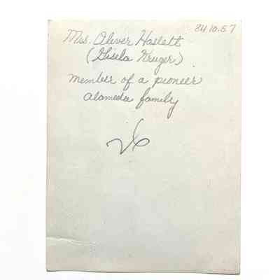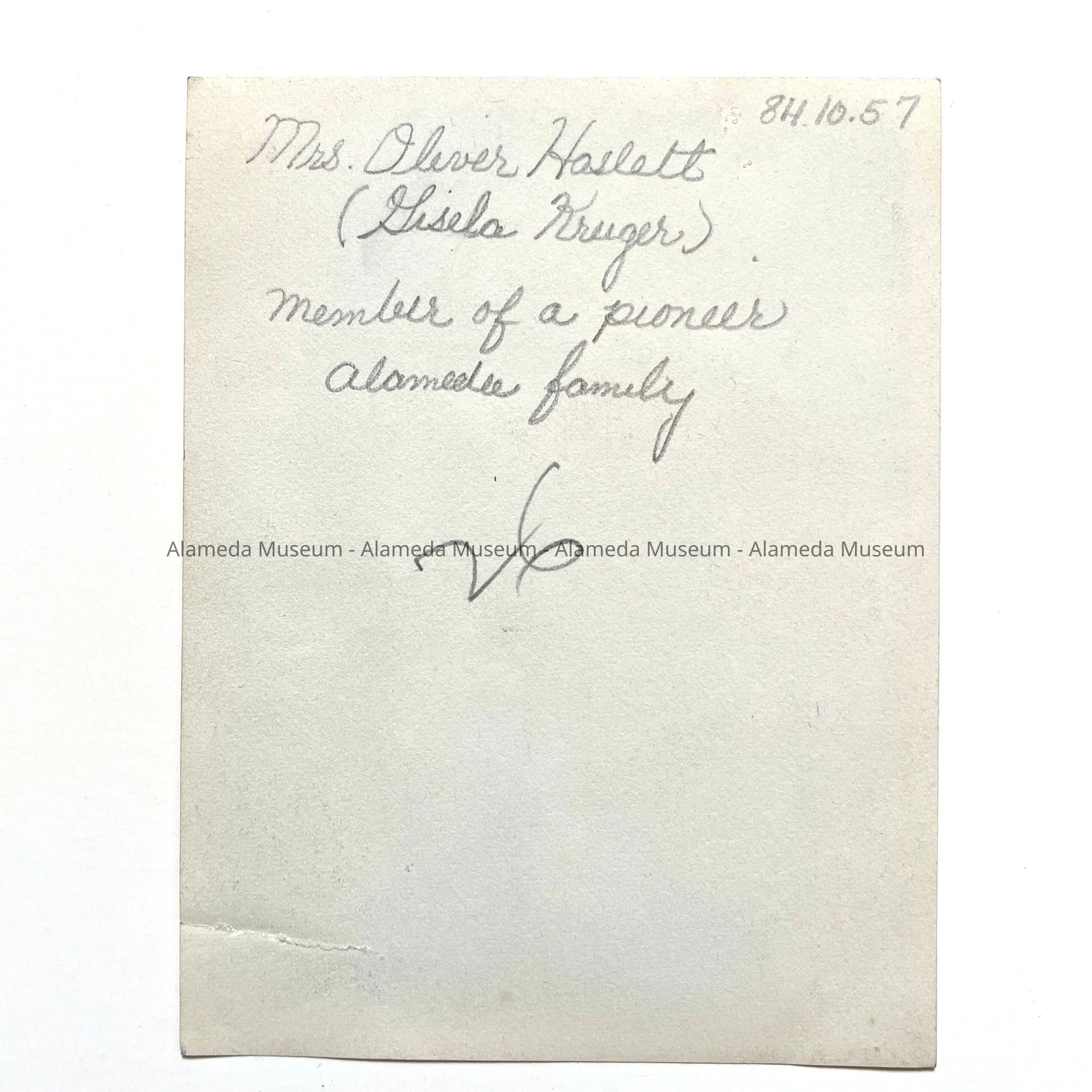 HISTORY OF OBJECT: Photograph of Mrs. Oliver Haslett. Member of a pioneer Alameda family. Photographer unknown.