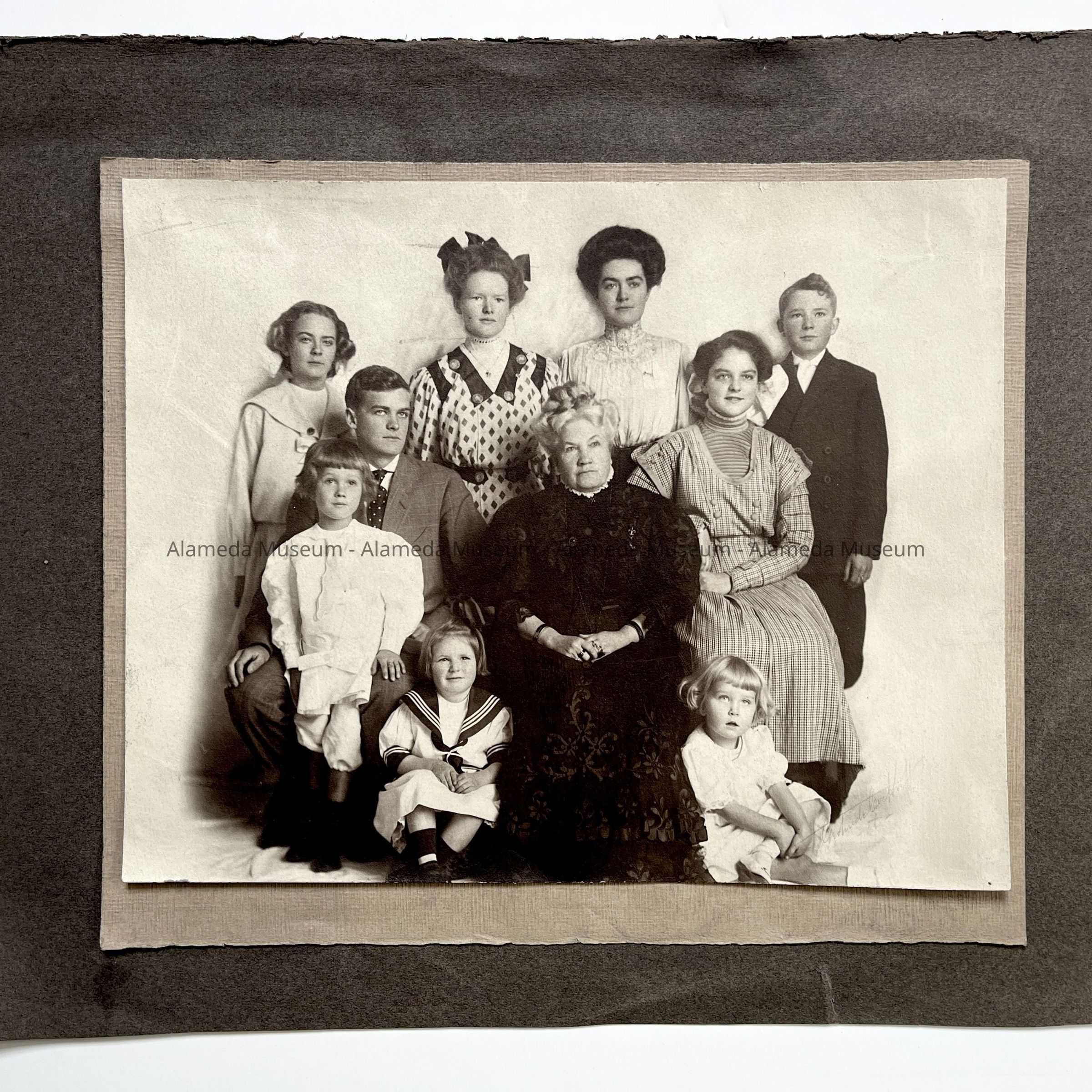 HISTORY OF OBJECT: Mrs. Samuel Haslett and grandchildren. Upper left-hand corner standing is Doris Haslett Goodman; second from right standing is Roberta Haslett; lower right-hand corner sitting is Kathleen Haslett Edwards. Members of a pioneer Alameda family.