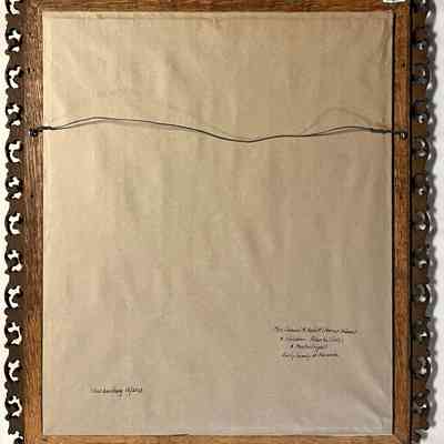 DESCRIPTION: Oak frame with elaborate lace effect gesso border open work; interior insert around frame is silver gesso. Frame houses an off white mat containing a sepia tone photograph (of three figures).
