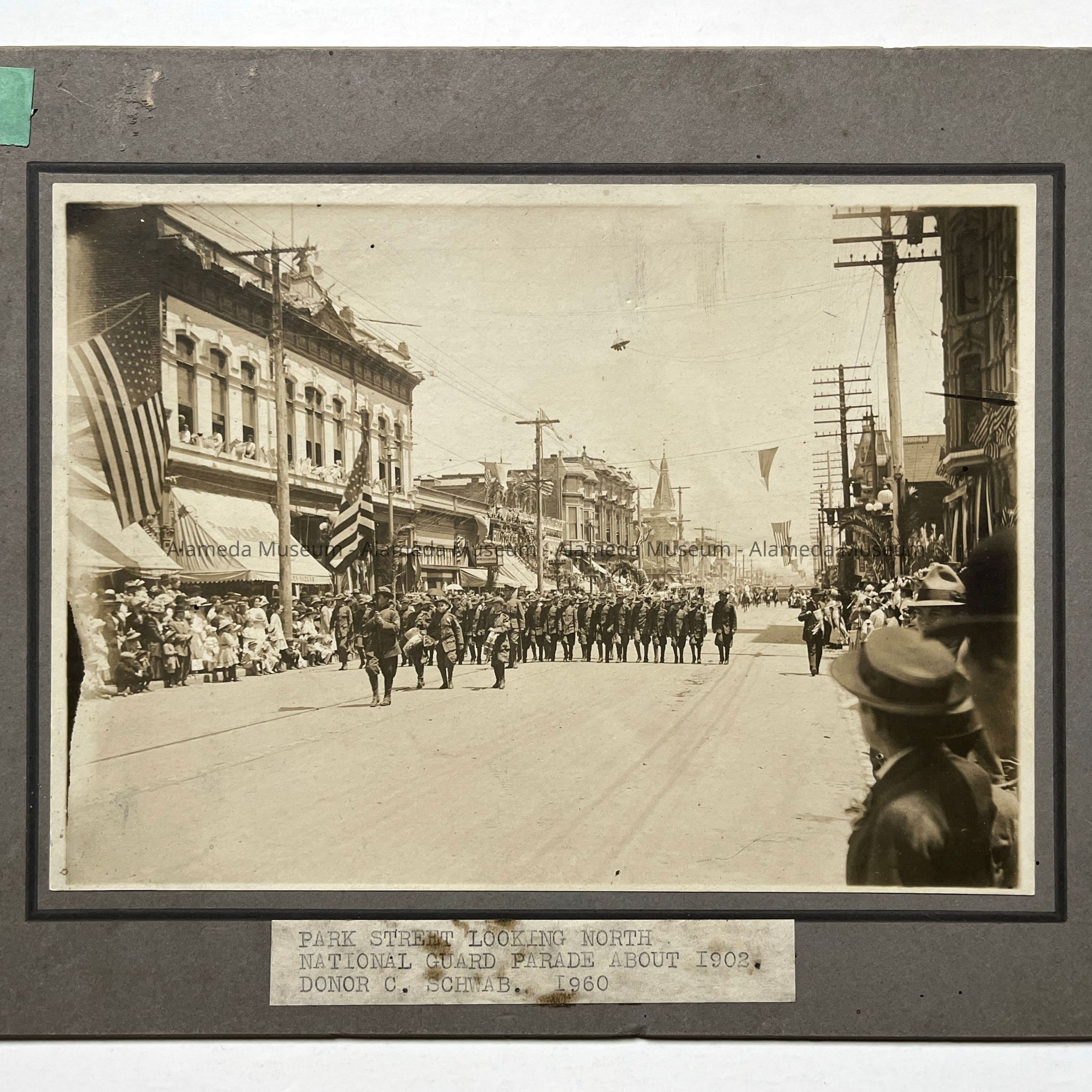 National Guard parade proceeding down Park Street on June 29, 1898. View is looking Northward. Good view of the military group, which is Alameda's Company G of the 5th National Guard Regiment. Second person from left has been identified as C.L. Helmstein.