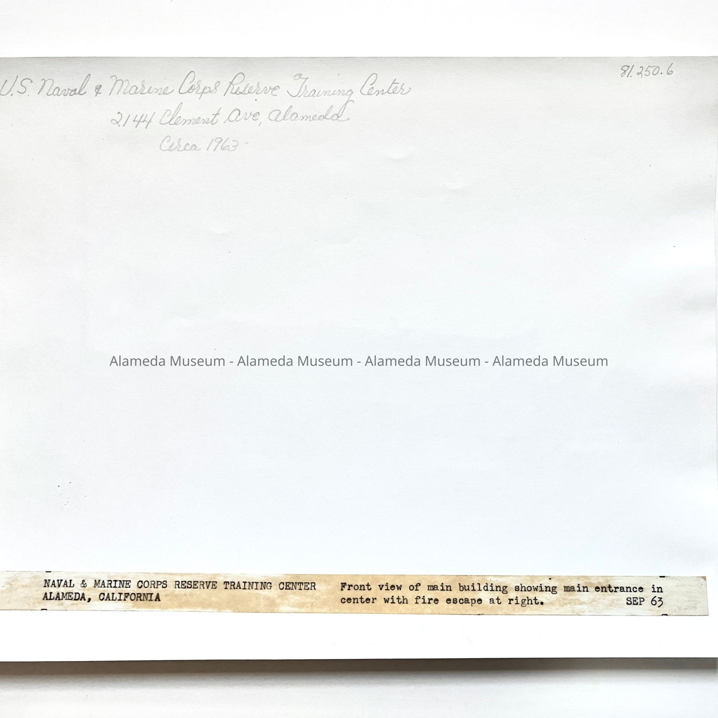 History of Object: Photograph Naval & Marine Corps Reserve Training Center, 2144 Clement Avenue, Alameda. Photo circa 1963.