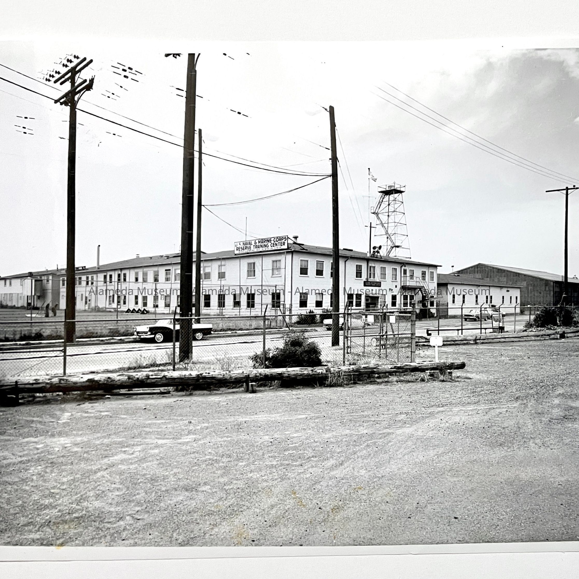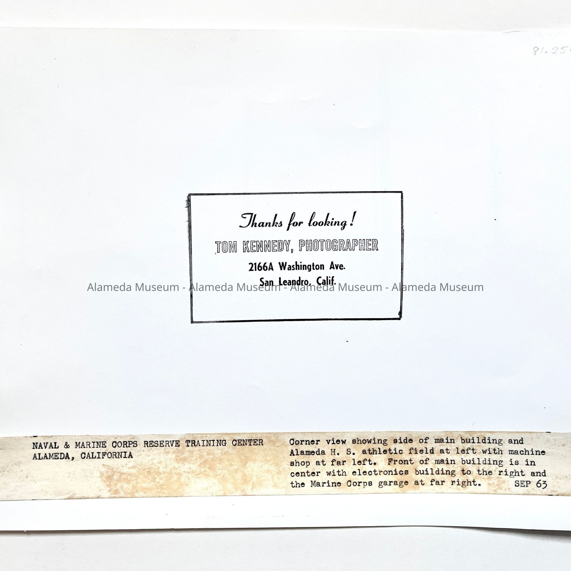 History of Object: Photograph of the Naval & Marine Corps Reserve Training Center, Alameda, Calif. Corner view showing side of main building and Alameda High School athletic field at left with machine shop at far left. Front of main building is in center, with electronics building to the right and Marine Corps garage at far right. Sept, 1963, (date). 2144 Clement Avenue.