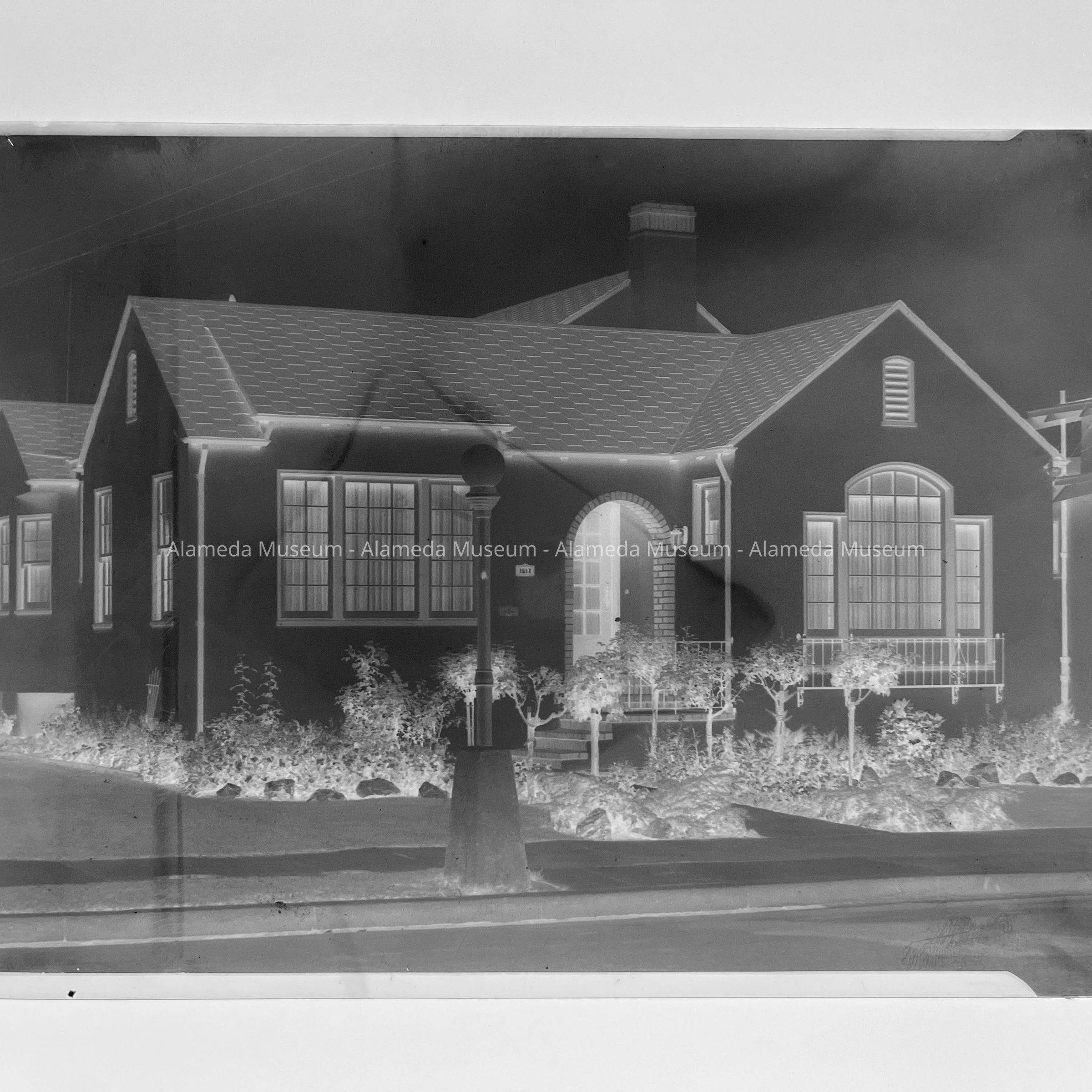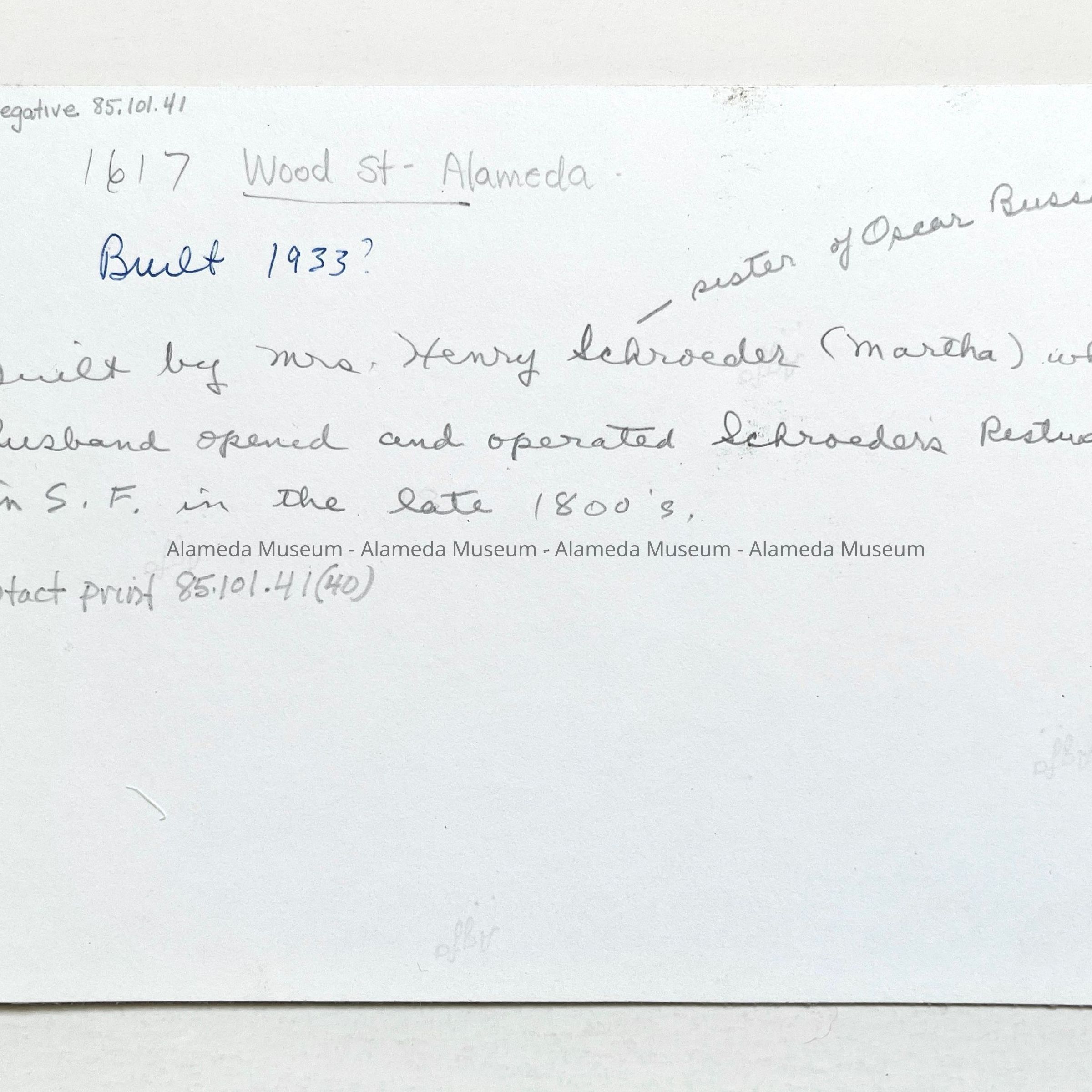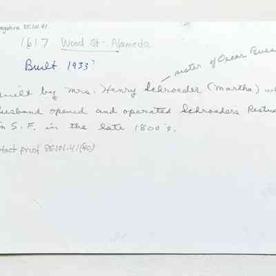 Photo negative Exterior of 1617 Wood Street, Alameda. Built by Mrs. Henry Schroeder (Martha) whose husband opened and operated Schroeder's Restaurant, San Francisco, in the late 1800's.