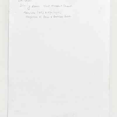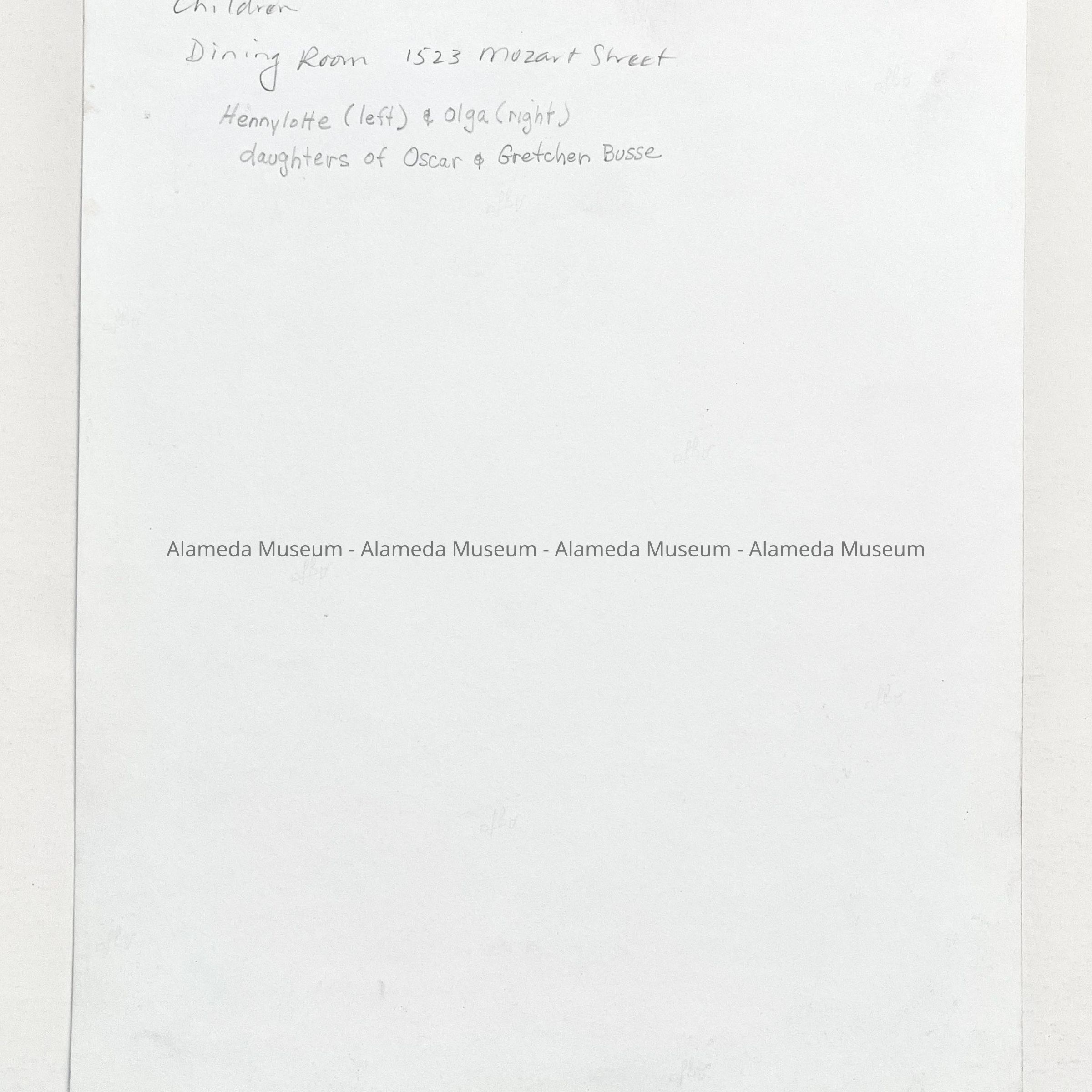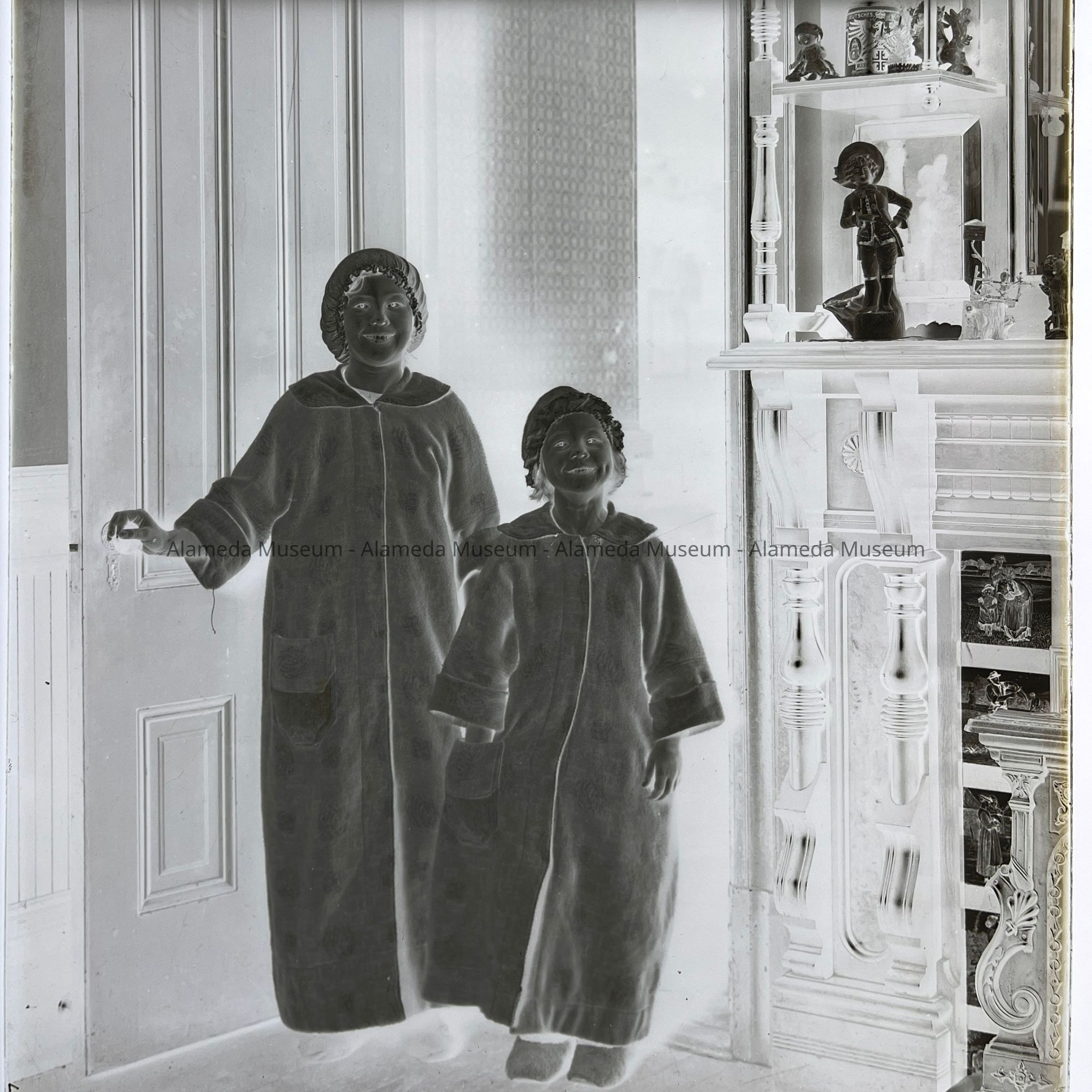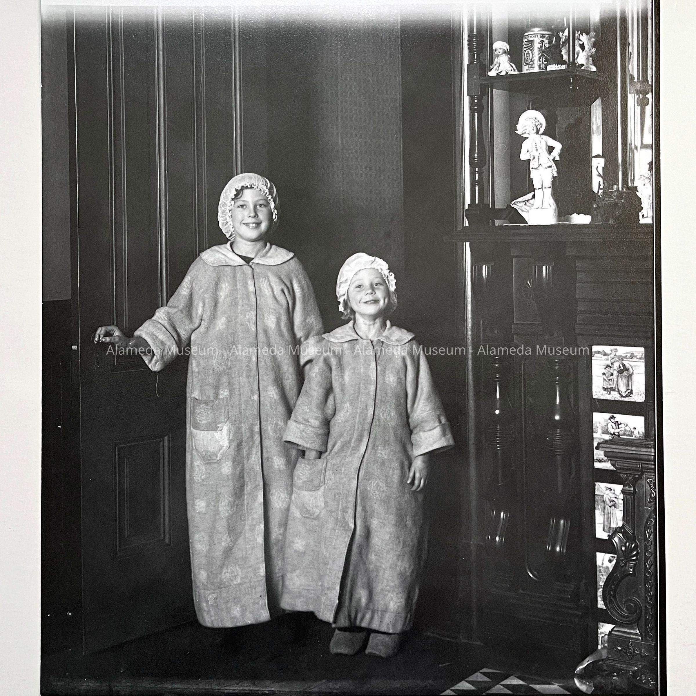 History of Object: Photo negative of Hennylotte & Olga, daughters of Oscar & Gretchen Busse, of 1523 Mozart Street, Alameda. They are shown standing in the doorway leading from the dining room to the kitchen of 1523 Mozart Street. Adjoining them is an elaborate Victorian style walnut mantle that still exists in the home (1985).