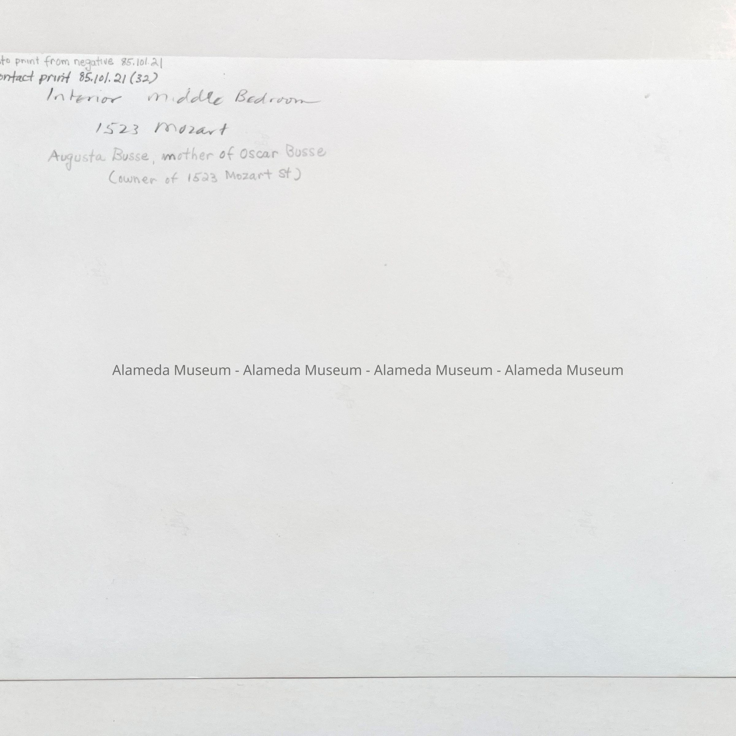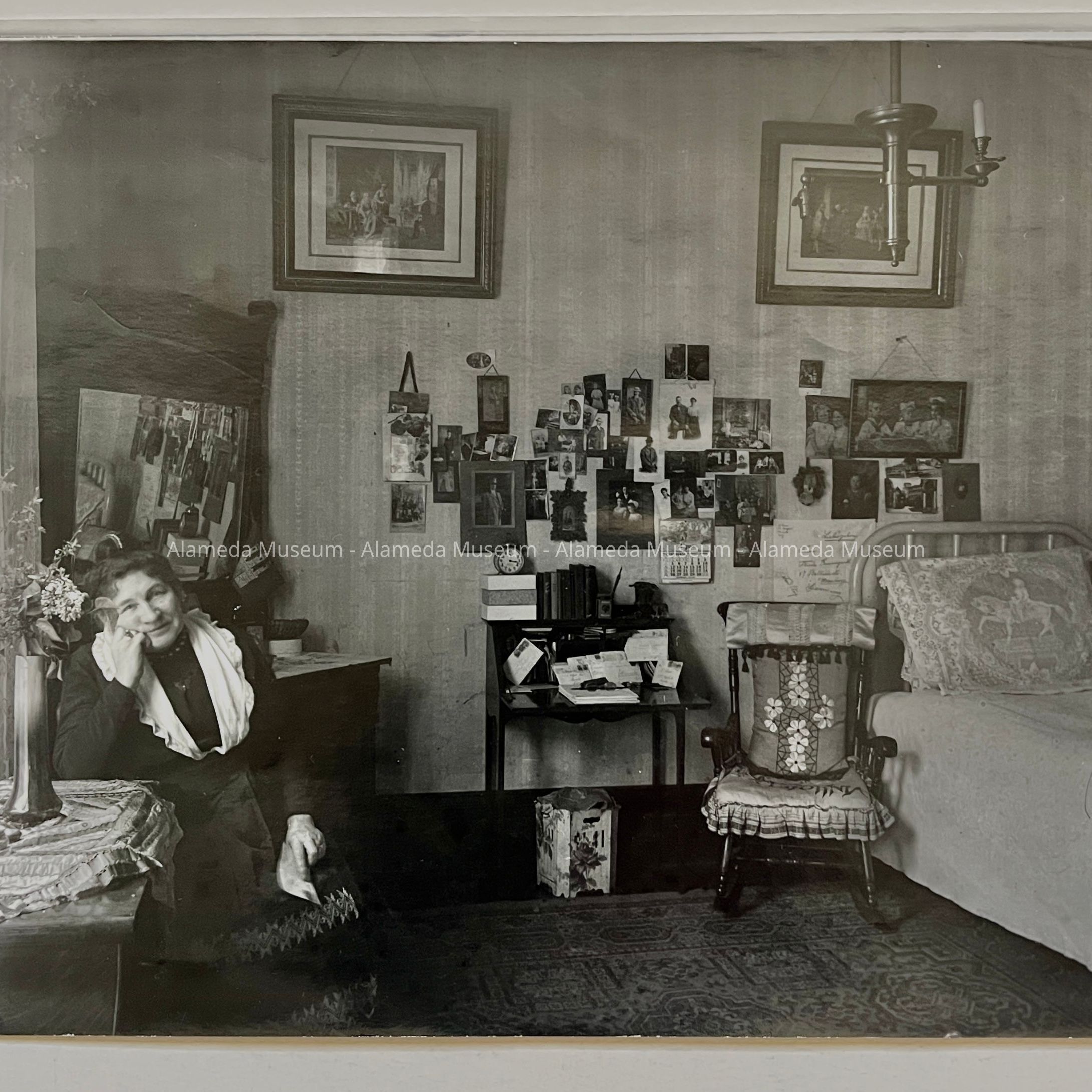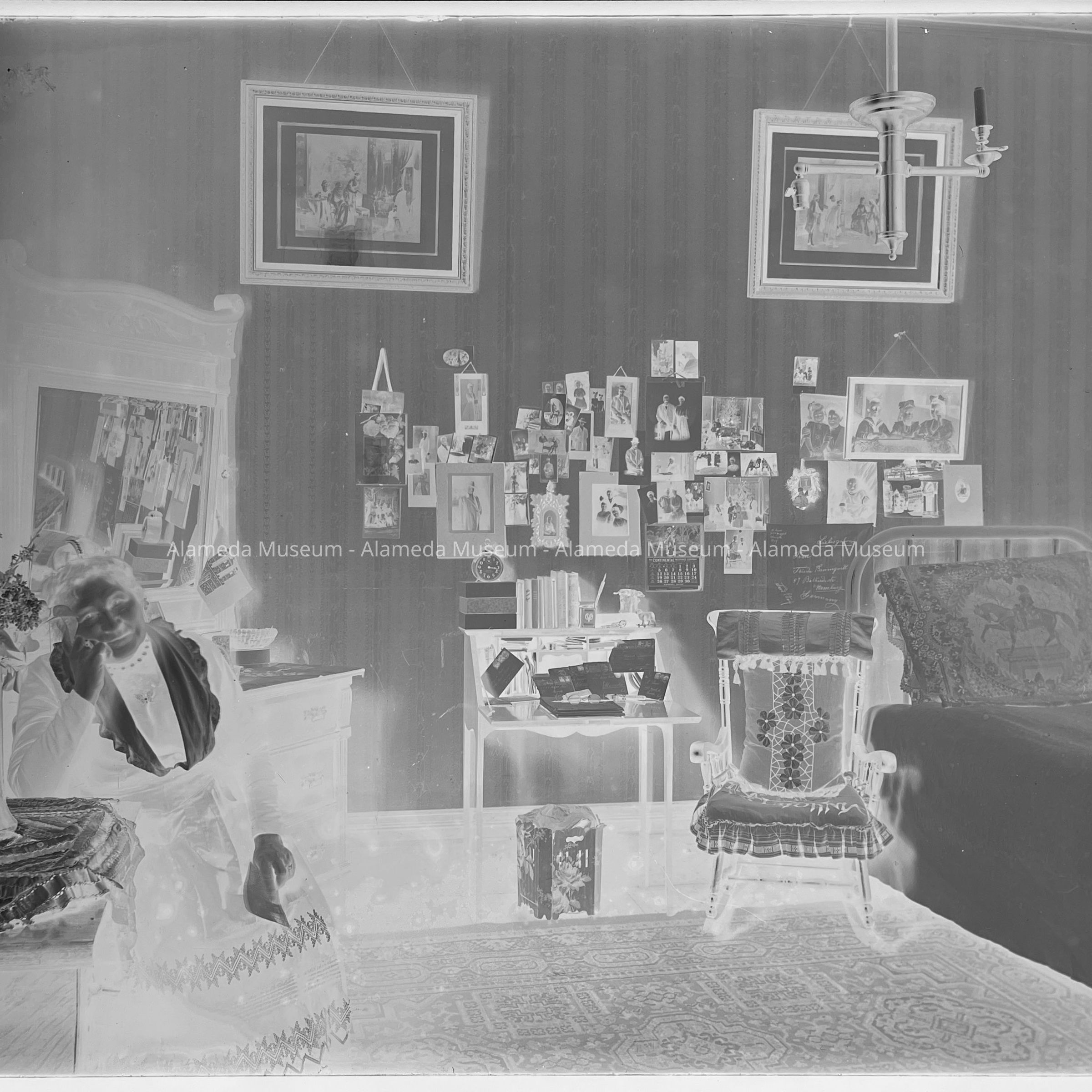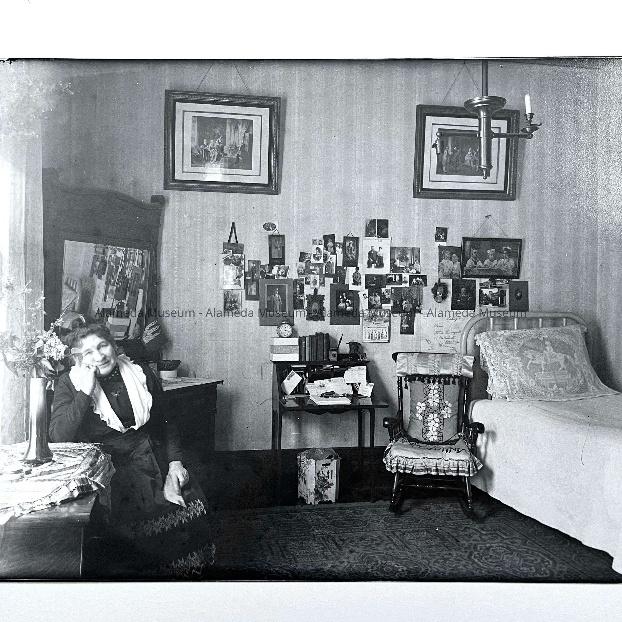 History of Object: Photo negative of Augusta Busse (mother of Oscar) sitting in her bedroom (second bedroom) of her son's home, 1523 Mozart Street, Alameda.
