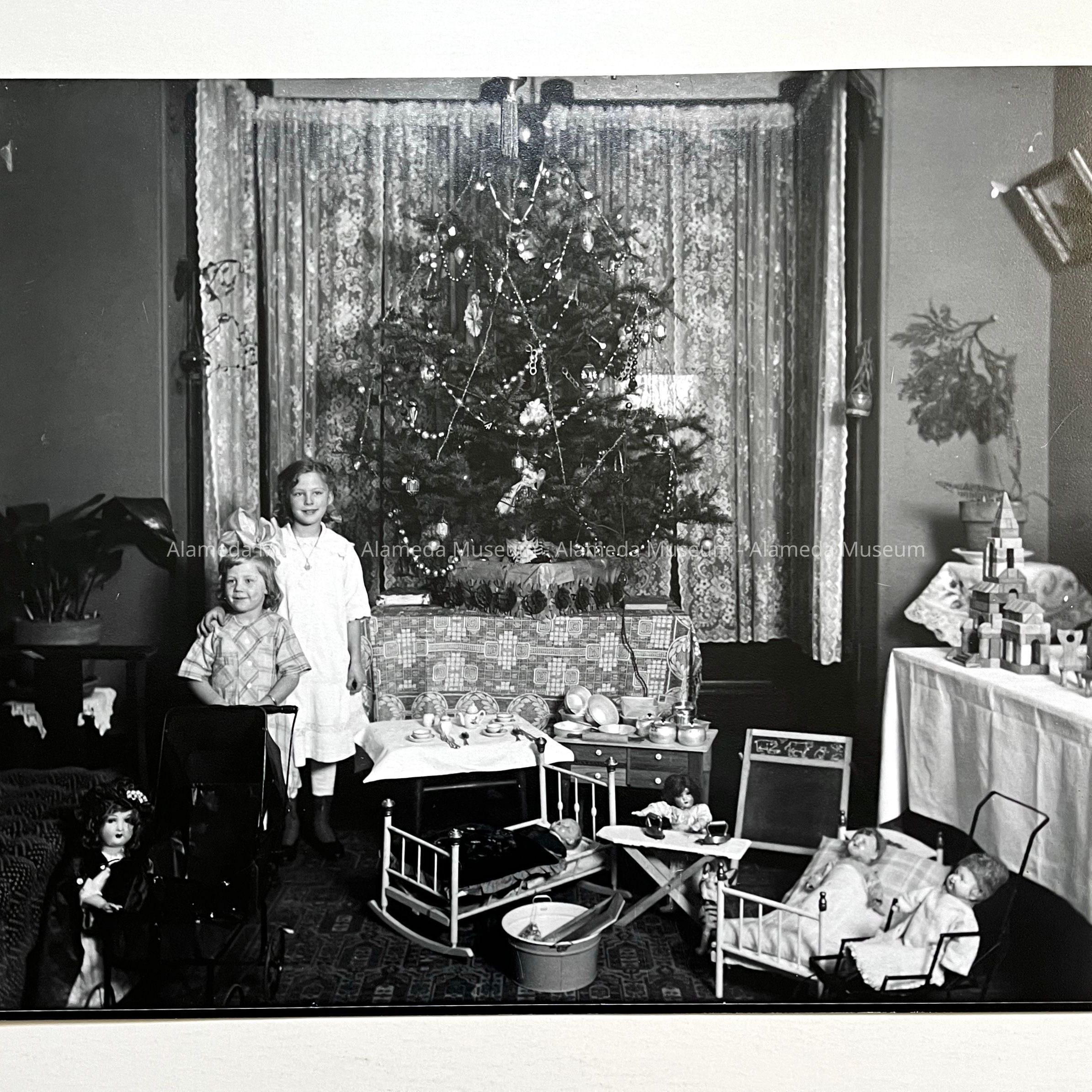 History of Object: Photo negative of Hennylotte & Olga, daughters of Oscar & Gretchen Busse, standing next to the Christmas tree in the bay window of their home at 1523 Mozart Street, Alameda.