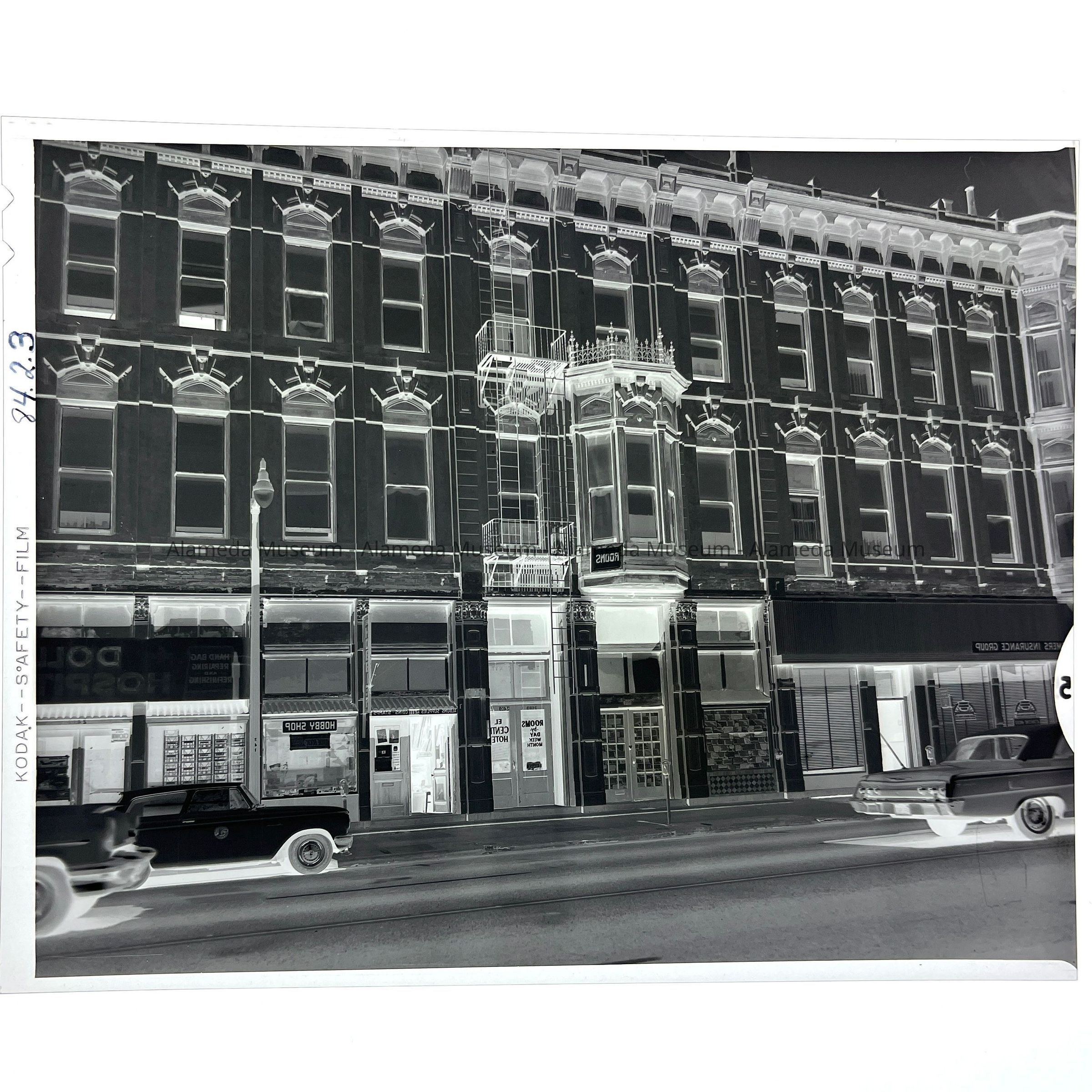 Photo negative of the Park Hotel (later known as the El Centro Hotel), erected 1879, northeast corner Park Street and Encinal Avenue. The present site of the Alameda Fire Dept. (Main Branch). Oct. 8, 1964. This view illustrates the main facade facing Encinal Avenue.