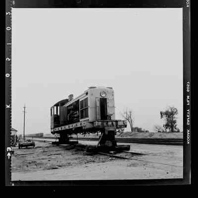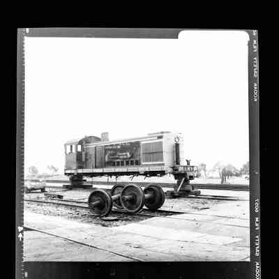 History of Object: Two views of Alameda Belt Line diesel locomotive #4 on blocks, wheels missing, being cannibalized for parts.