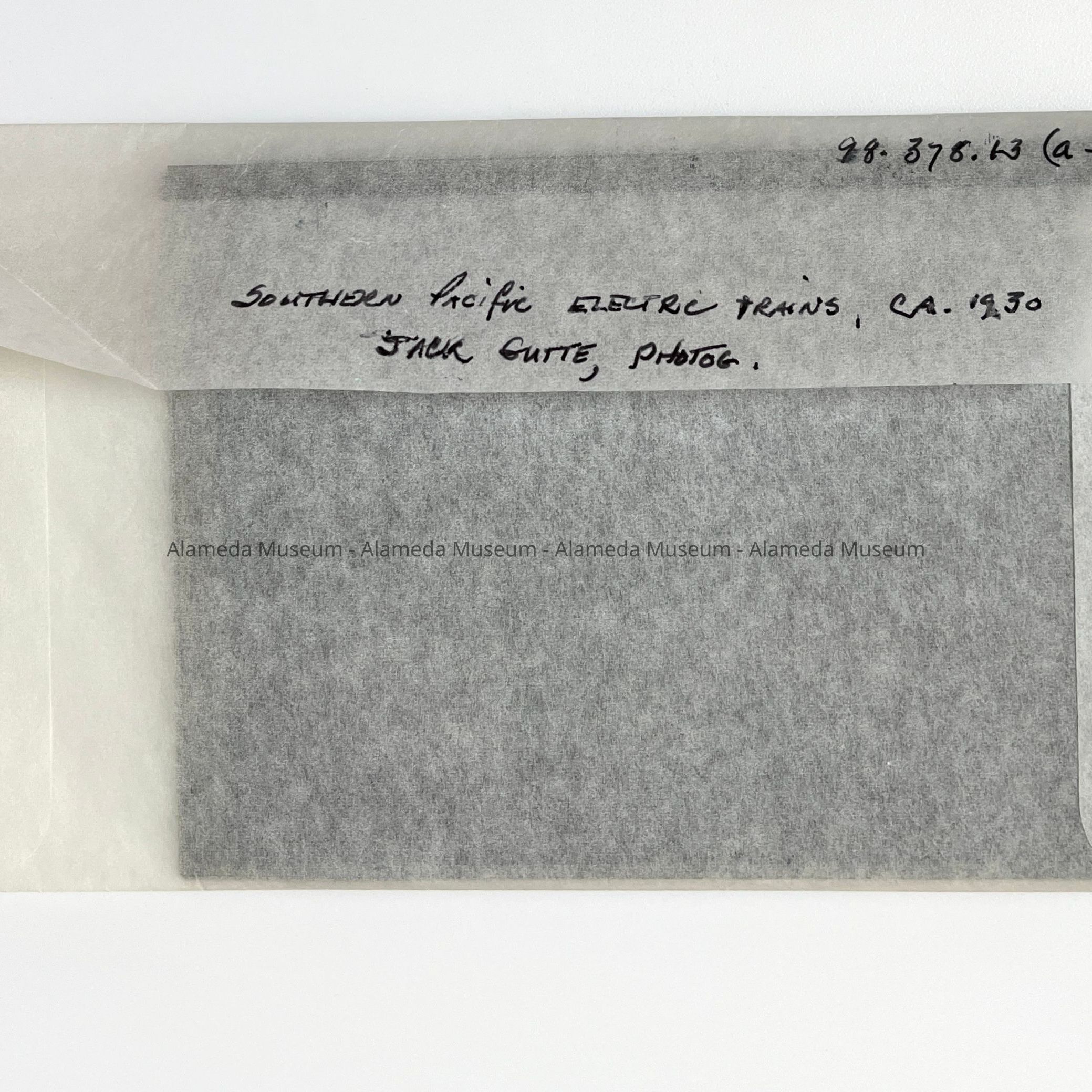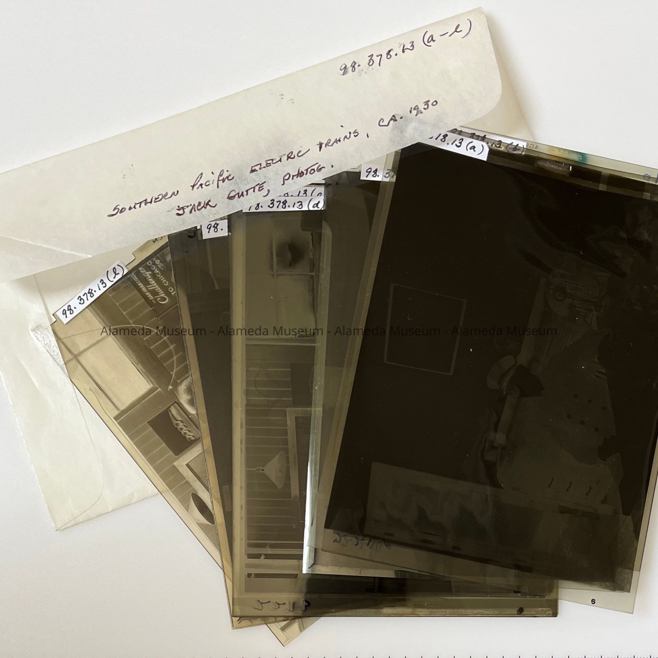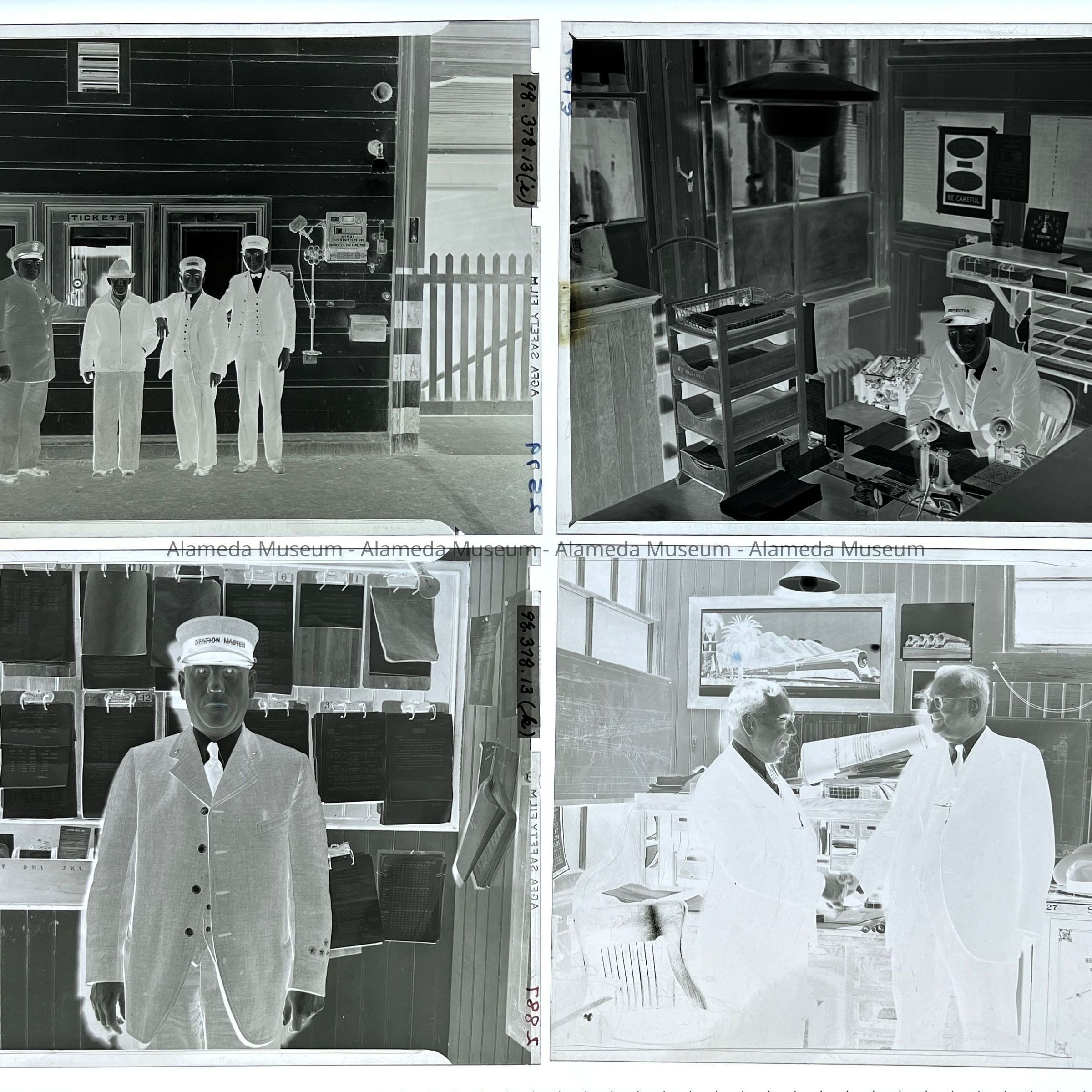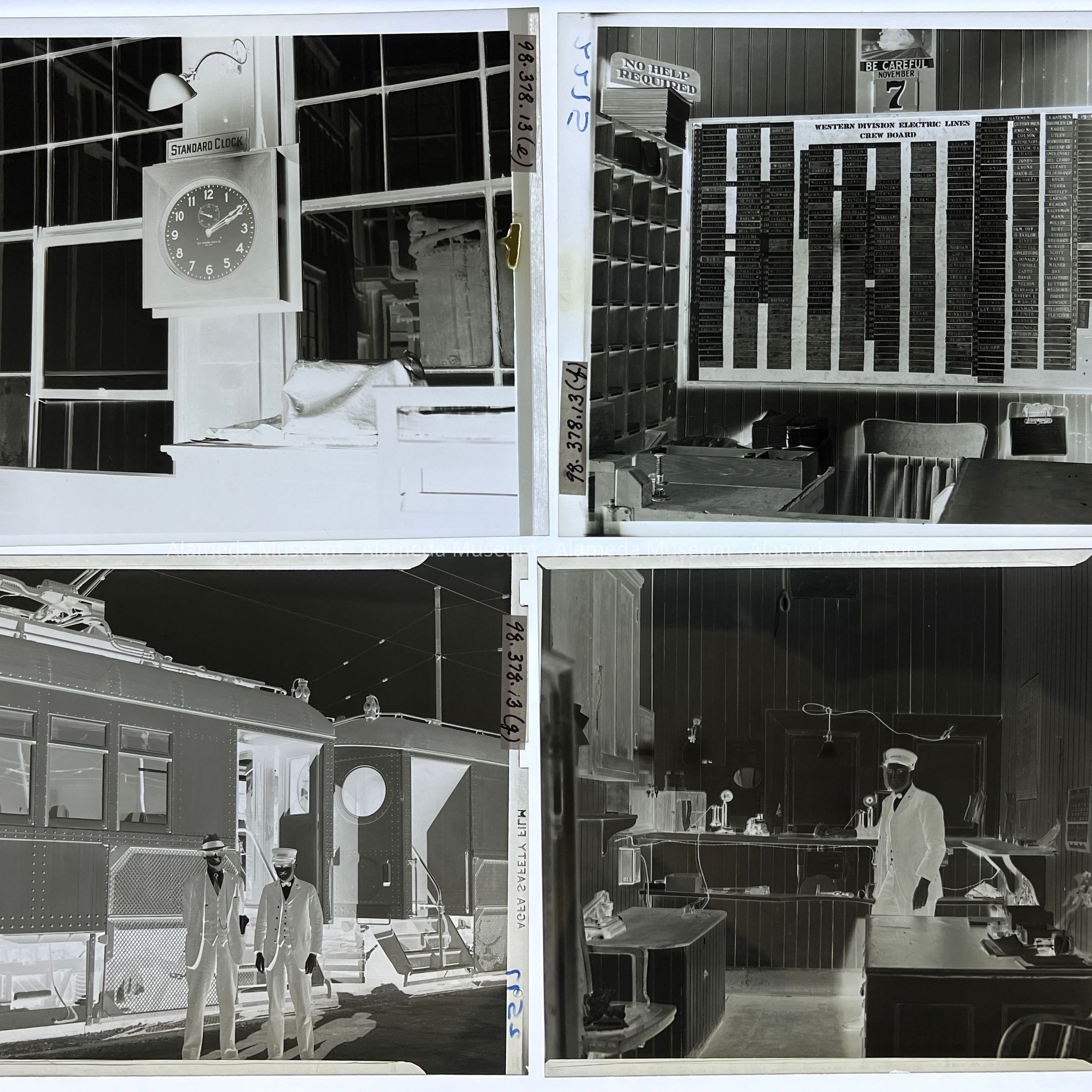 History of Object: Photographic negative set featuring mostly employees of the Southern Pacific Railroad who operated the electric train system in Alameda. Many of the images are "occupational", showing employees at work in their work site.