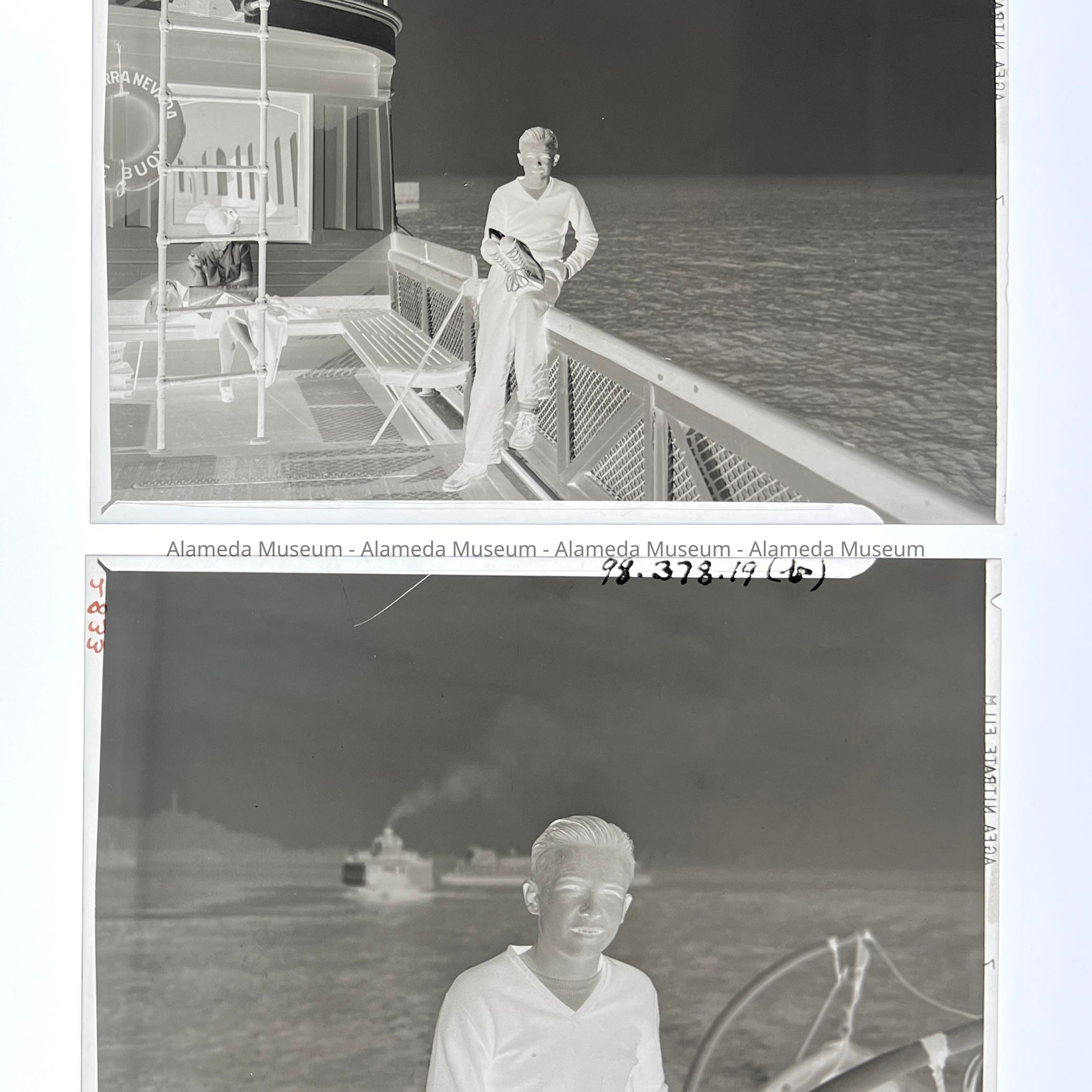 History of Object: Two views of an unidentified young man aboard the Southern Pacific ferryboat "Sierra Nevada".