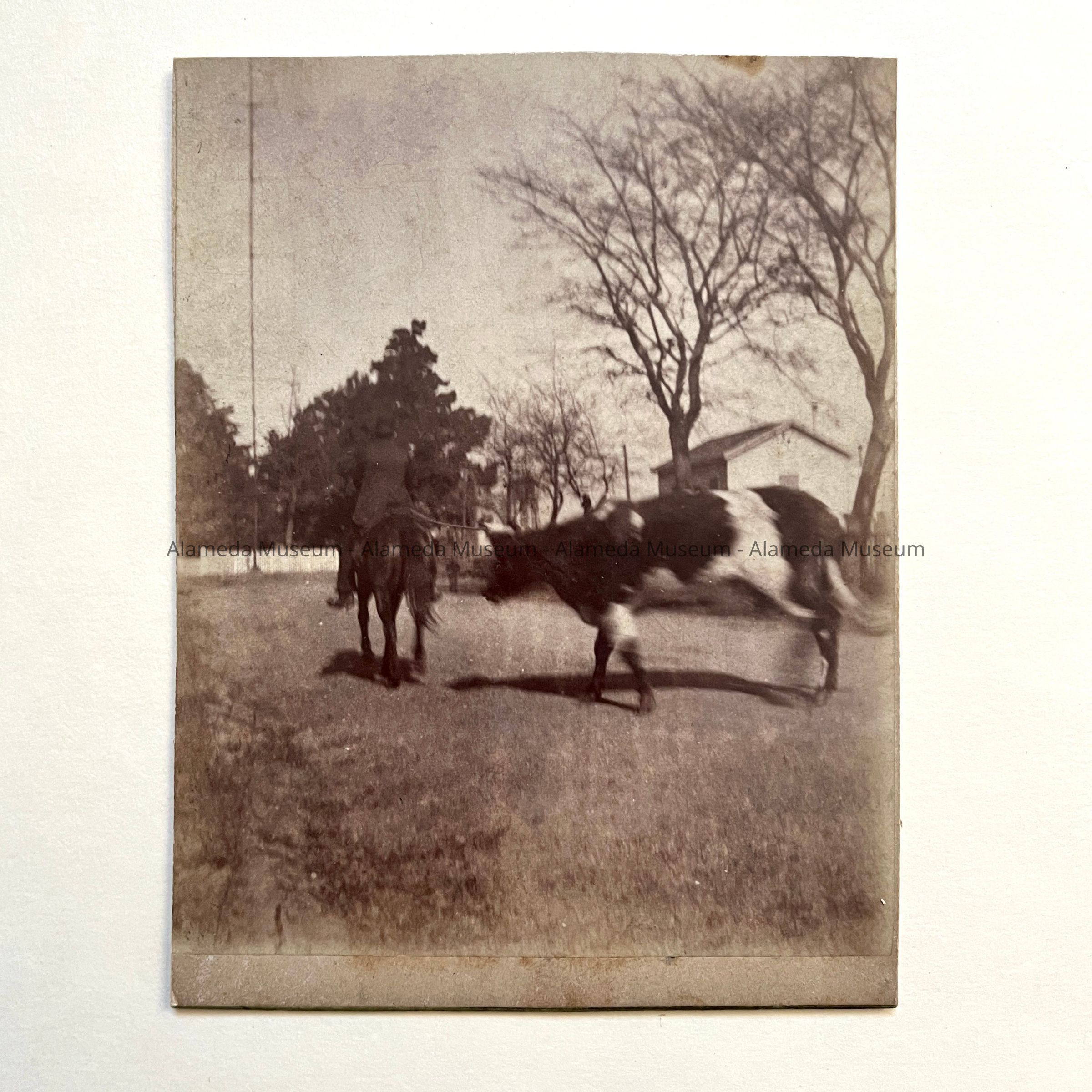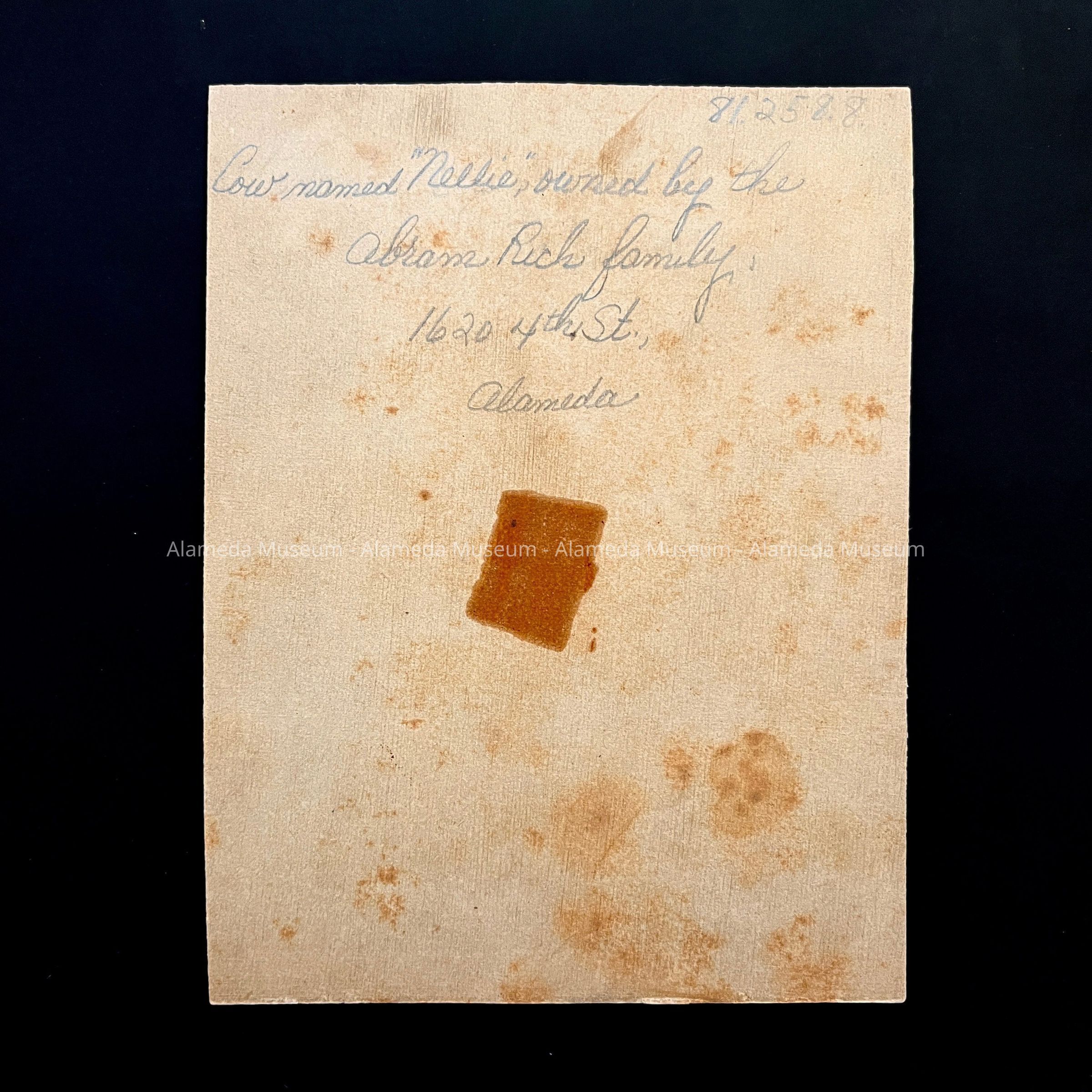 Photograph of the cow named "Nellie" owned by the Abram Rich family, 1620 4th Street, Alameda, early pioneer residents of the West End.