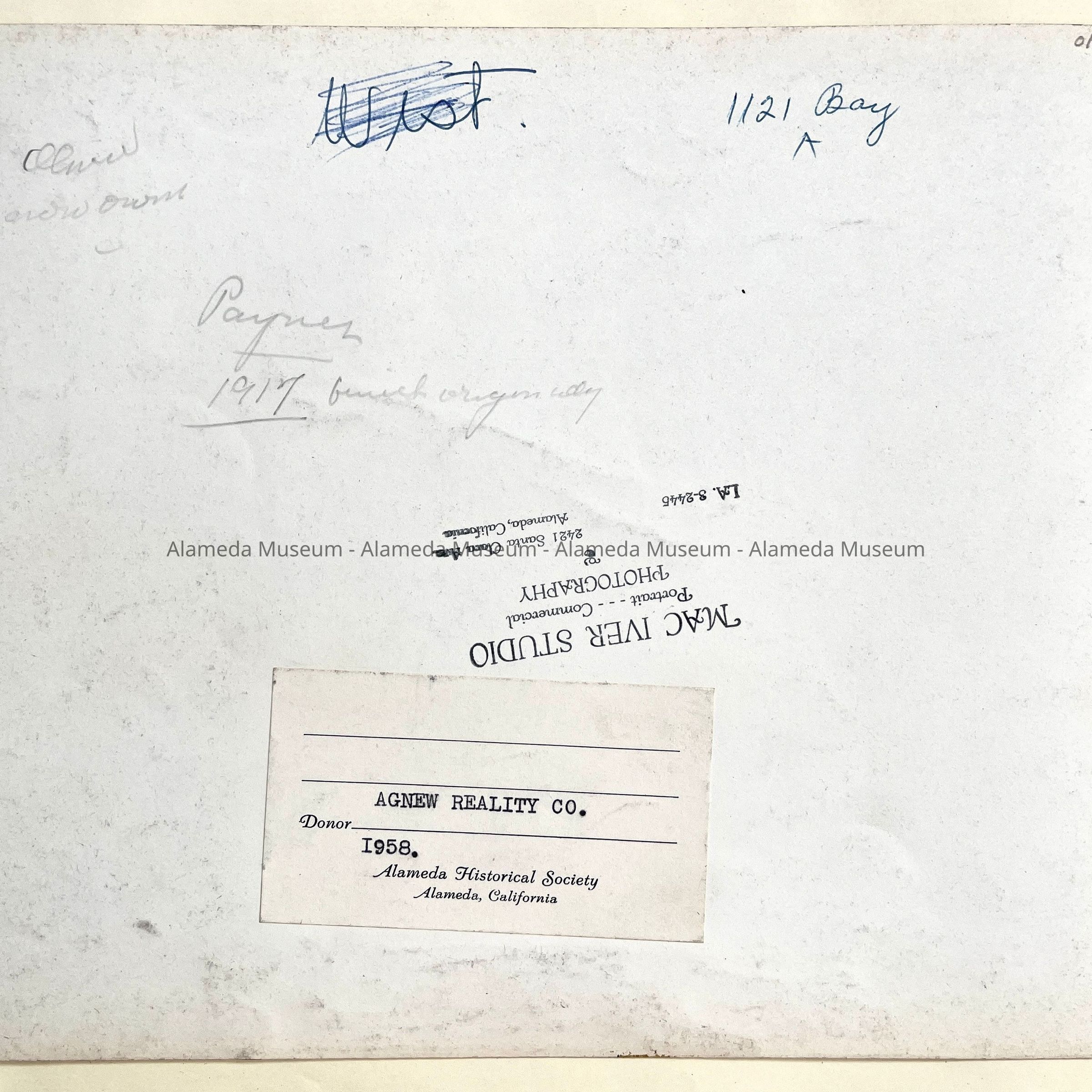Description: Black and white glossy photograph, signed on the reverse side by Maclver Studio, 2421 Santa Clara Avenue.