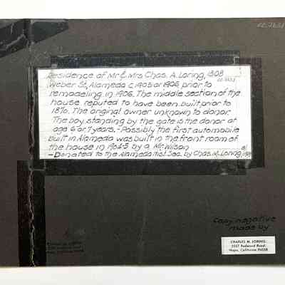 History: Photograph of 1308 Weber Street during the occupancy of Mr. and Mrs. Charles A. Loring. The donor has included information about the house and is pictured standing at the fence at the age of 6 or 7 years old. The house was erected in 1886.